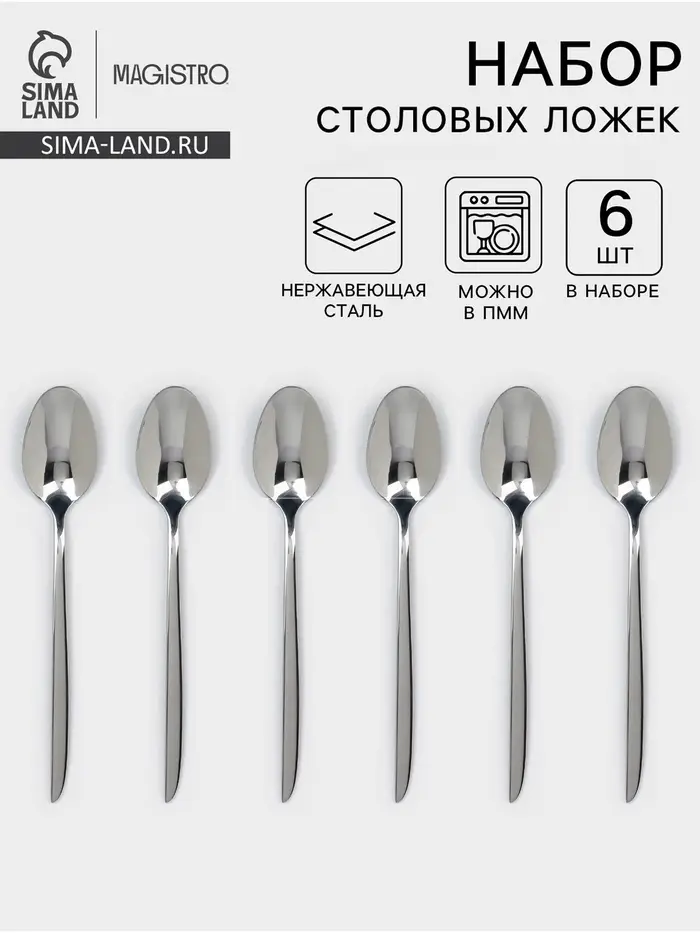 В комплект входят шесть ложек, выполненных из нержавеющей стали, что гарантирует долговечность и устойчивость к коррозии.