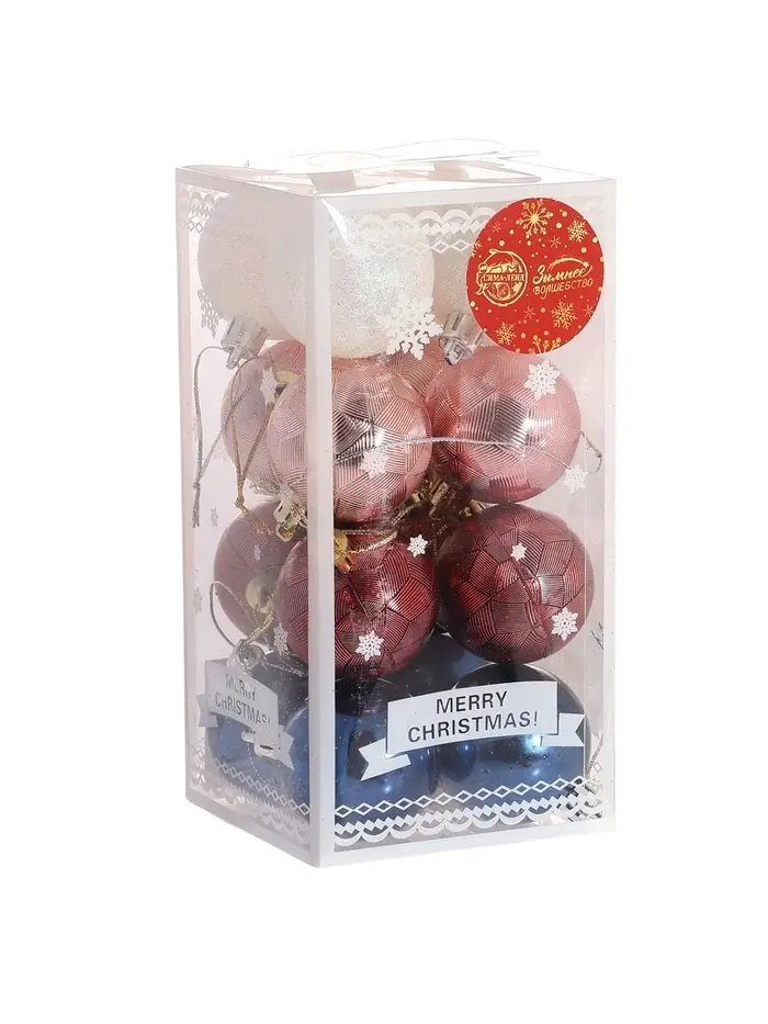 - Комплект из 16 шаров среднего размера, подходящих для плотного и сбалансированного украшения ёлки.
