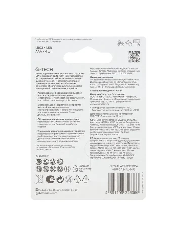 Все батарейки торговой марки GP сертифицированы согласно российскому стандарту ГОСТ и международным стандартам ISO9001 и ISO14001.