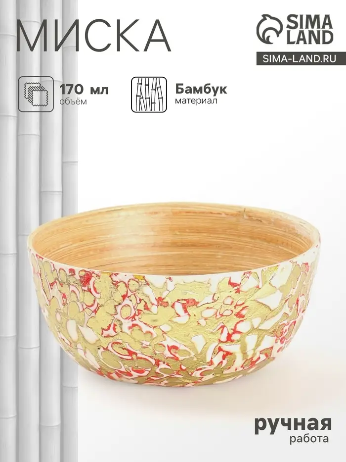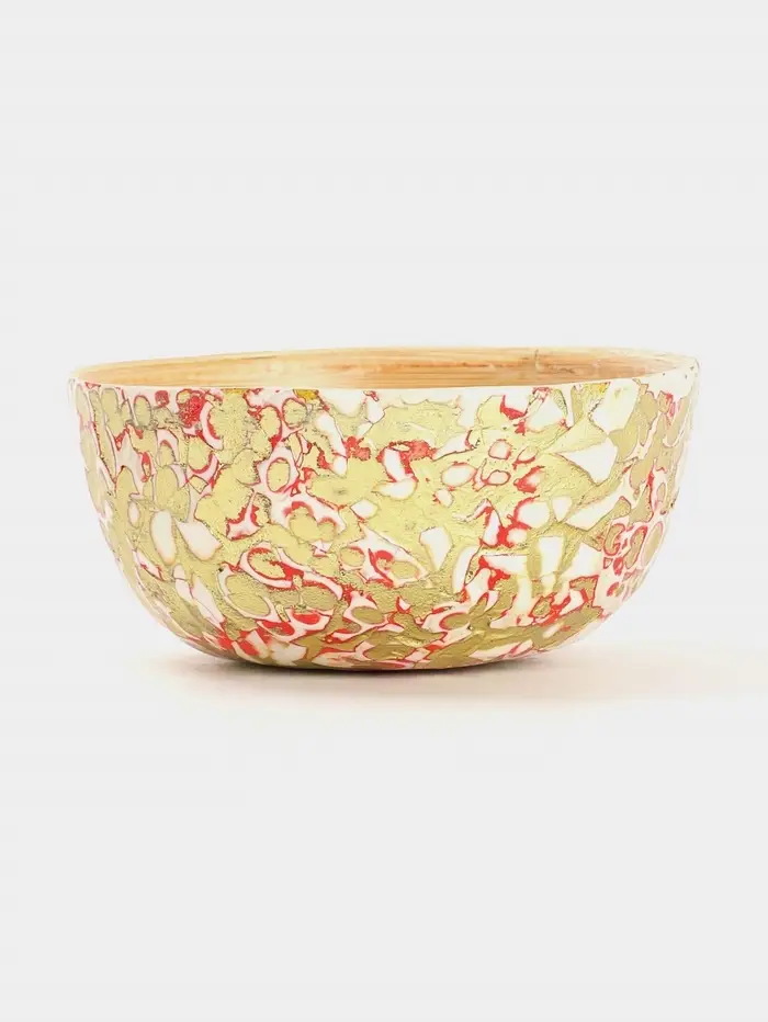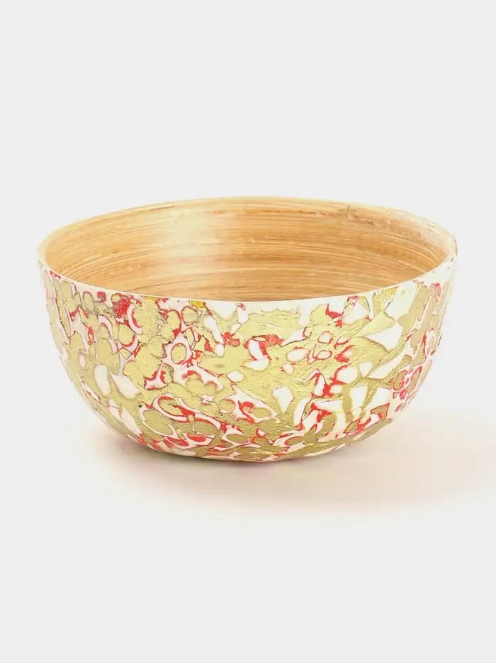 Элегантная бамбуковая миска, сочетает в себе натуральность и стильный дизайн. Прекрасно подойдет для подачи закусок или фруктов, добавив изюминку вашему столу. Золотистые, красные и белые узоры оживляют каждый прием пищи. Диаметр 10 см и ручная работа делают миску настоящим произведением искусства. Использовать для горячих блюд можно, а мыть в посудомоечной машине - нет. Гладкая текстура и круглая форма. Легкость и практичность без компромиссов.