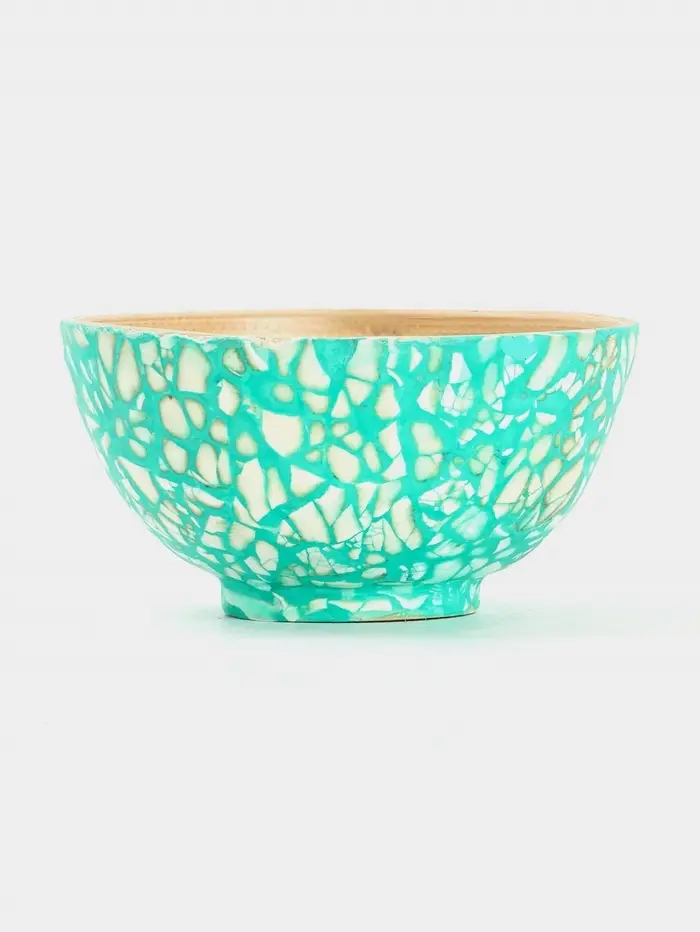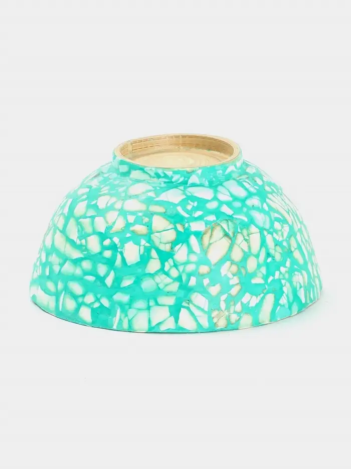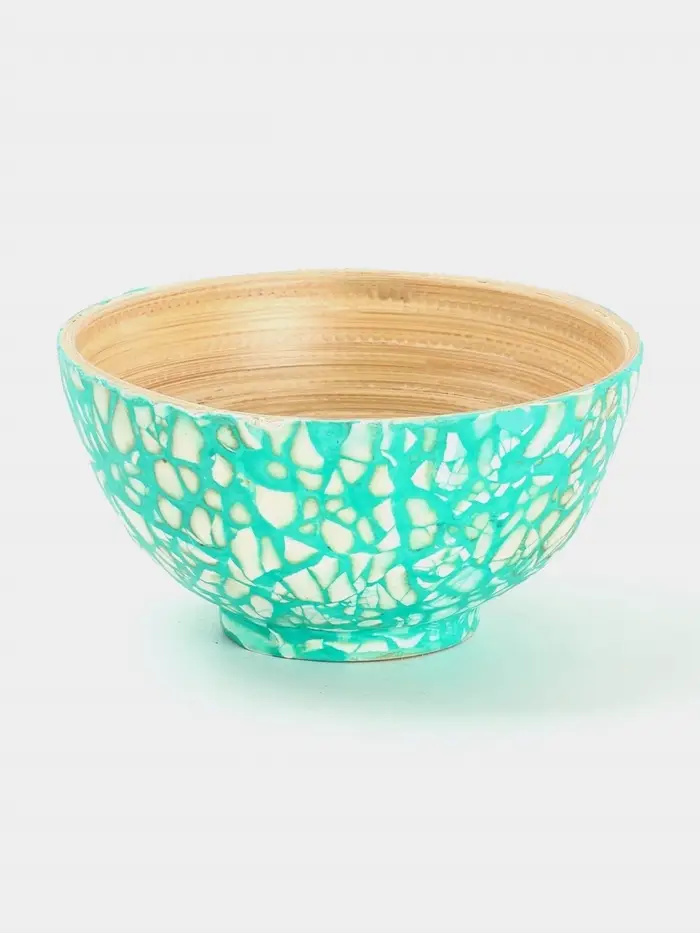 Круглая миска из бамбука, диаметром 12 см и высотой 6 см. Прекрасный выбор для сервировки и подачи блюд. Бирюзовый и белый цвета создают стильную комбинацию с узорчатым рисунком, украшенным вручную. Невозможно использовать в микроволновой печи. Рекомендуется ручная мойка. Подходит для горячей пищи.