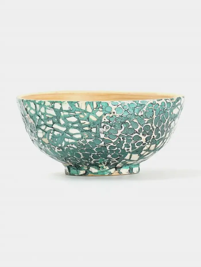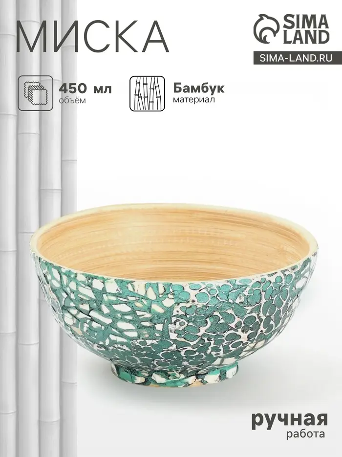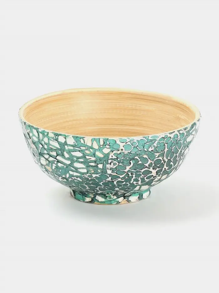 Миска сделана из натурального бамбука и отличается изысканным дизайном с узорами. Диаметр 14 см делает её идеальной для сервировки еды и подачи блюд. Гладкая текстура и ручная работа придают изделию уникальность. Цветовая палитра, включающая зеленый и белый, легко впишется в любой интерьер. Миска создана для горячих блюд, однако её нельзя использовать в СВЧ-печи и мыть в посудомоечной машине. Превосходное решение для тех, кто ценит экологичность и стиль.