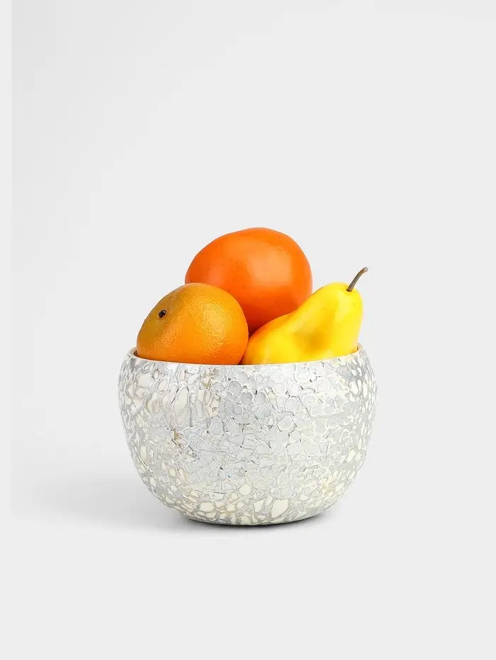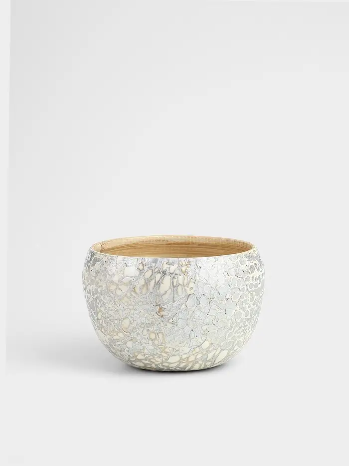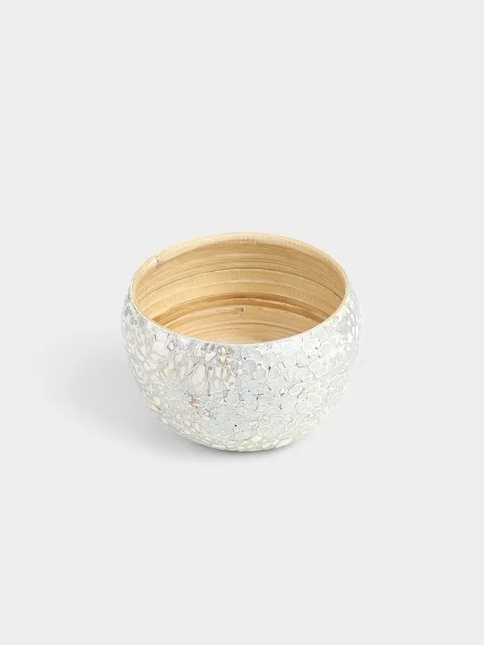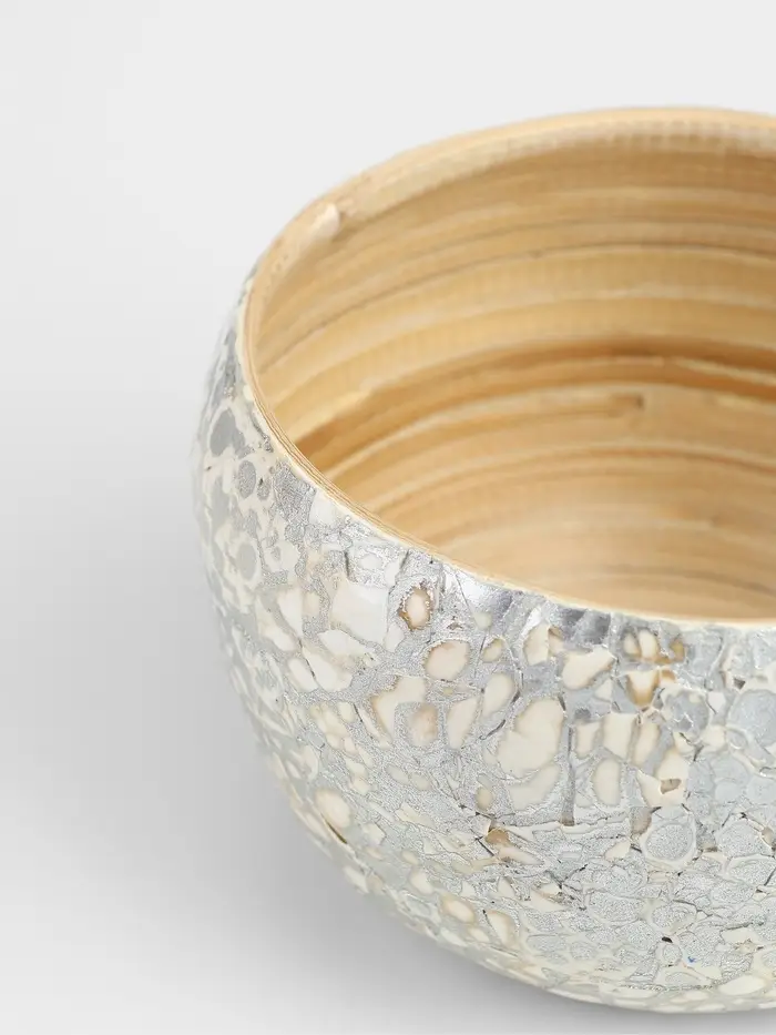 Элегантная ваза из бамбука с узором, выполненная в серебристо-белых тонах. Её изысканная текстура и ручная работа делают эту вазу настоящим произведением искусства. Идеально подходит для декорирования интерьера и хранения горячих цветов благодаря устойчивости бамбука к высоким температурам. Диаметр вазы - 15 см, высота - 9 см - универсальный размер для любого интерьера.