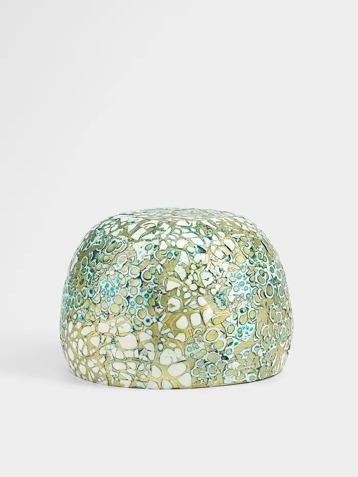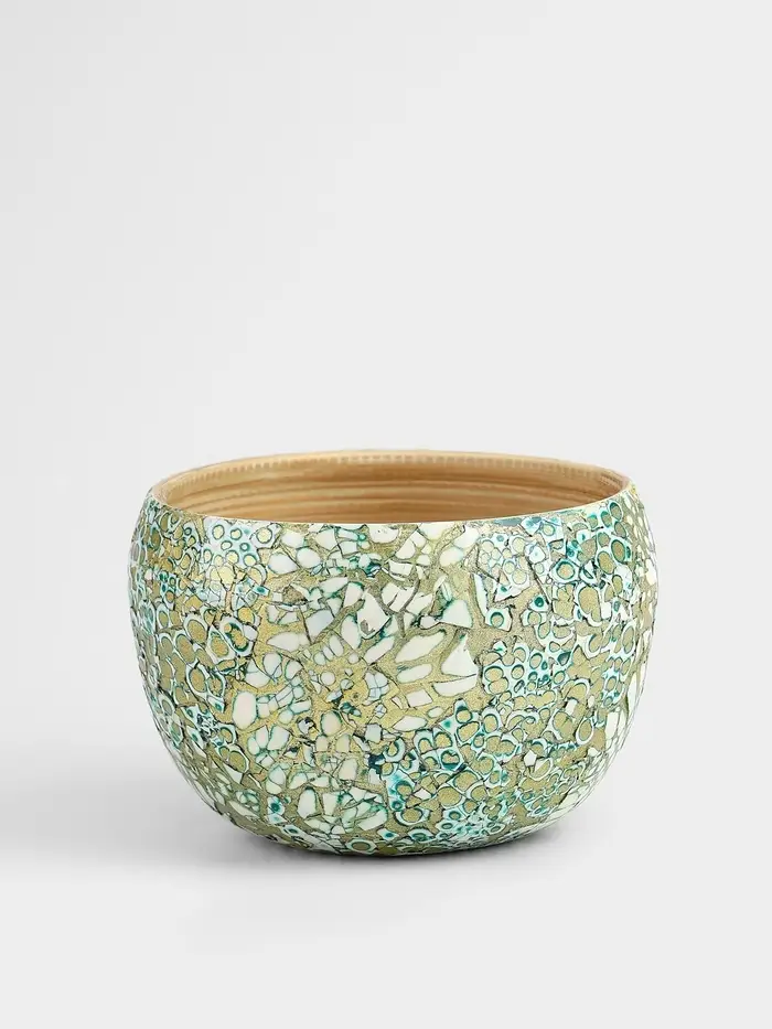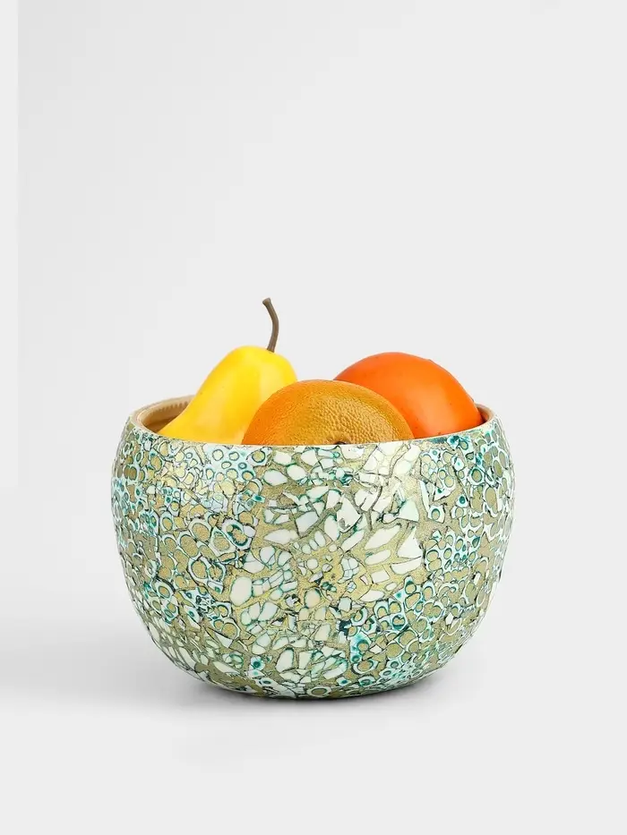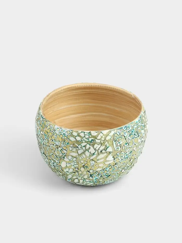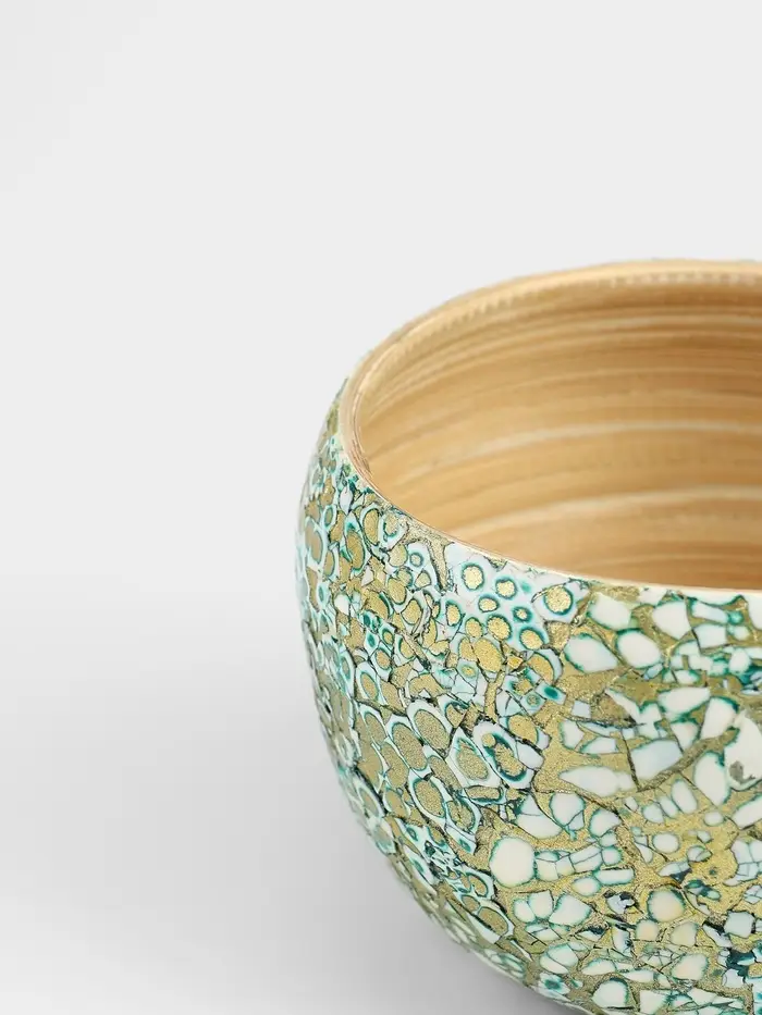 Бамбуковая ваза размером 15×15×10.5 см. Элегантное решение для интерьера, сочетающеё белый и золотистый цвета. Покрытая узорами, она привносит тепло и уют в ваш дом. Уникальная ручная работа делает каждое изделие неповторимым. Гладкая текстура и круглая форма добавляют ей изысканность. Подходит для цветочных композиций и сухоцветов.