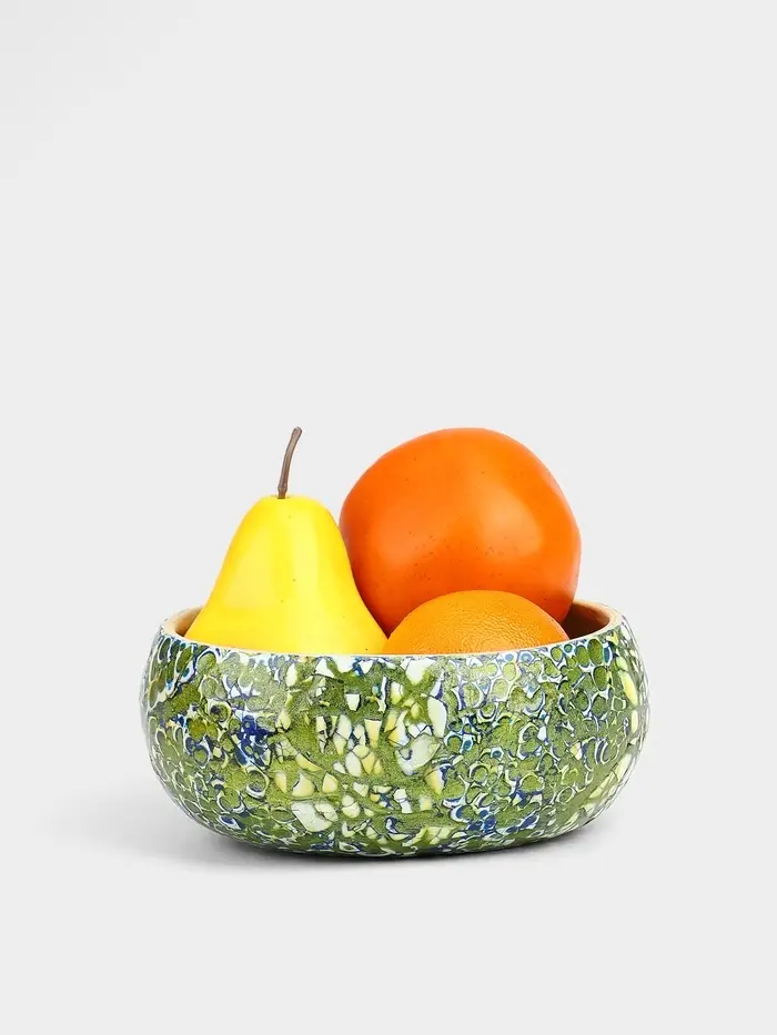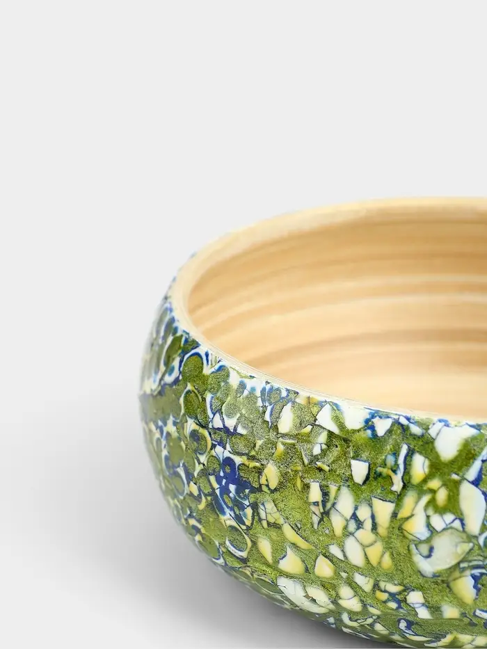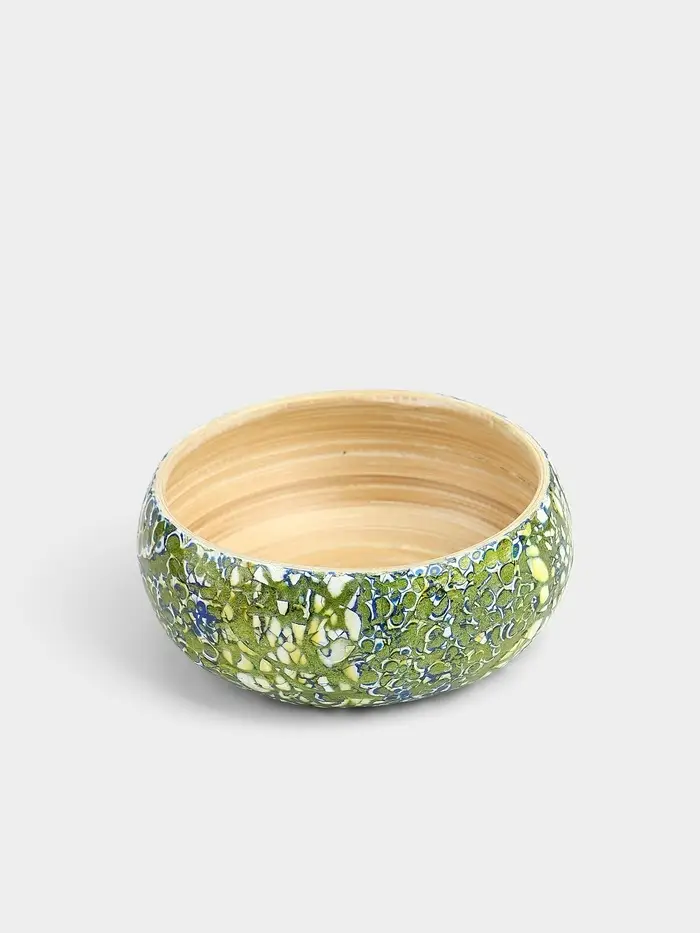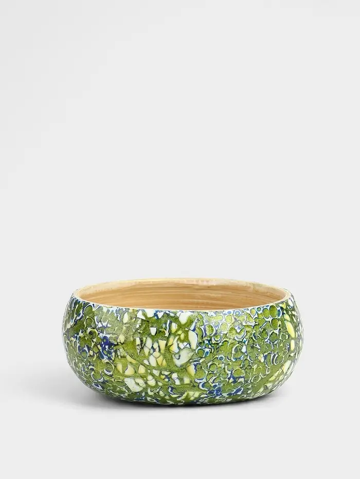 Элегантная и стильная ваза диаметром 15 см и высотой 6 см, изготовленная из экологически чистого бамбука. Белое покрытие с золотистыми узорами, выполненными вручную, придаёт вазе роскошный вид. Гладкая текстура и практичная круглая форма делают её идеальным элементом декора для любого интерьера.