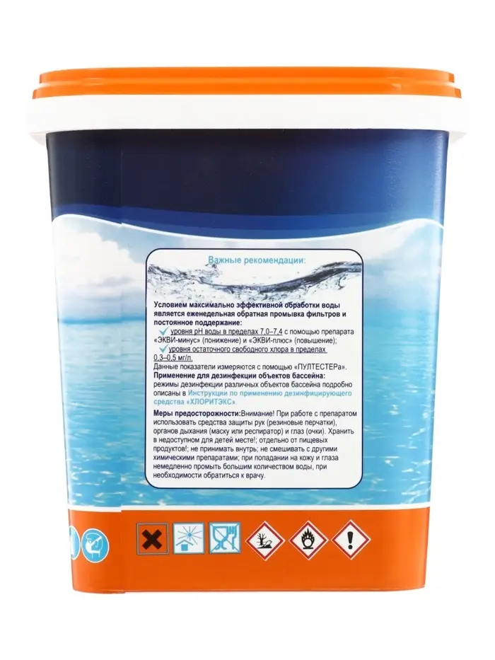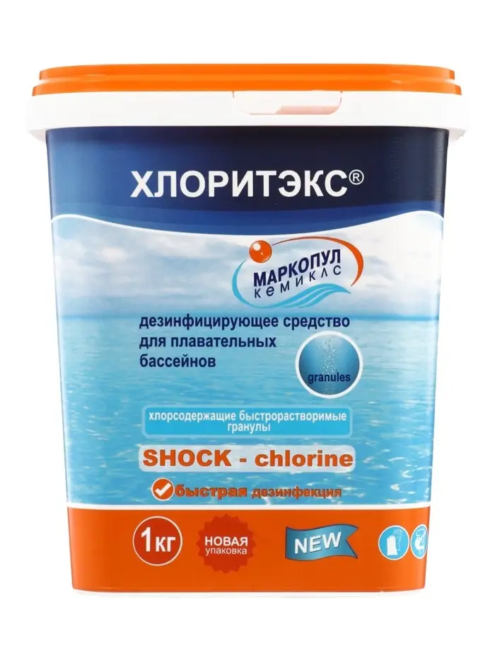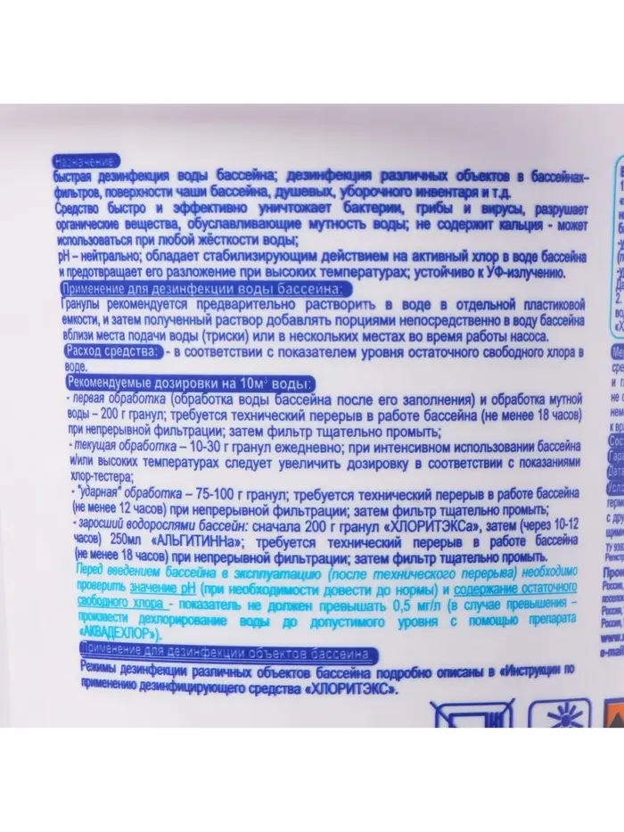 Хлоритэкс эффективно и быстро обеззараживает бактерии, грибки и вирусы; разрушает органические вещества, обуславливающие мутность воды; не содержит кальция – может использоваться при любой жесткости воды; pH-нейтрален; обладает стабилизирующим действием на активный хлор в воде бассейна и предотвращает его разложение при высоких температурах; устойчив к УФ-излучению.