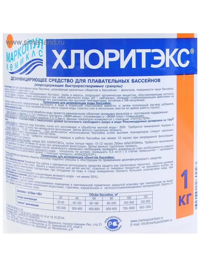- “Ударная” обработка – 75-100 г на 10м3 воды. Технический перерыв в работе бассейна (не менее 12 часов) при непрерывной фильтрации. Затем фильтр тщательно промыть.