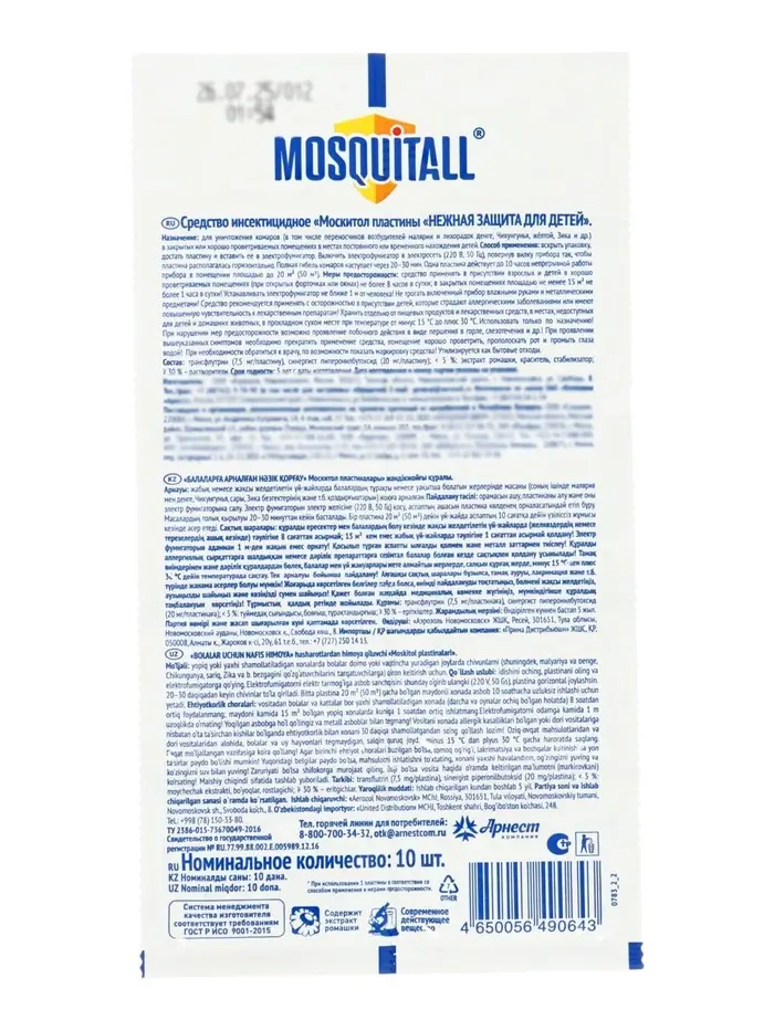 Описание: пластины от комаров надежно и бережно защищают спокойный сон и отдых ребенка на протяжении всей ночи. Они быстро и эффективно уничтожают кровососущих насекомых внутри помещений.Благодаря четко выверенной концентрации действующего вещества последнего поколения использование пластин максимально безопасно и разрешено в присутствии детей.Время действия пластины: до 10 часов.Трансфлутрин в несколько раз менее токсичен, чем проллетрин, и, следовательно, более безопасен согласно данным Всемирной организации здравоохранения (WHO).Состав: трансфлутрин (7,5 мг/пластину), синергист пиперонилбутоксид (20 мг/пластину), < 5 %: экстракт ромашки, краситель, стабилизатор Агидол, ≥ 30 % – растворители.Способ применения Вскрыть упаковку, достать пластину и вставить ее в электрофумигатор. Включить электрофумигатор в электросеть (220 В, 50 Гц), повернув вилку прибора так, чтобы пластина располагалась горизонтально. Полная гибель комаров наступает через 20-30 мин.Срок годности: 60 месяцев с даты изготовления.
