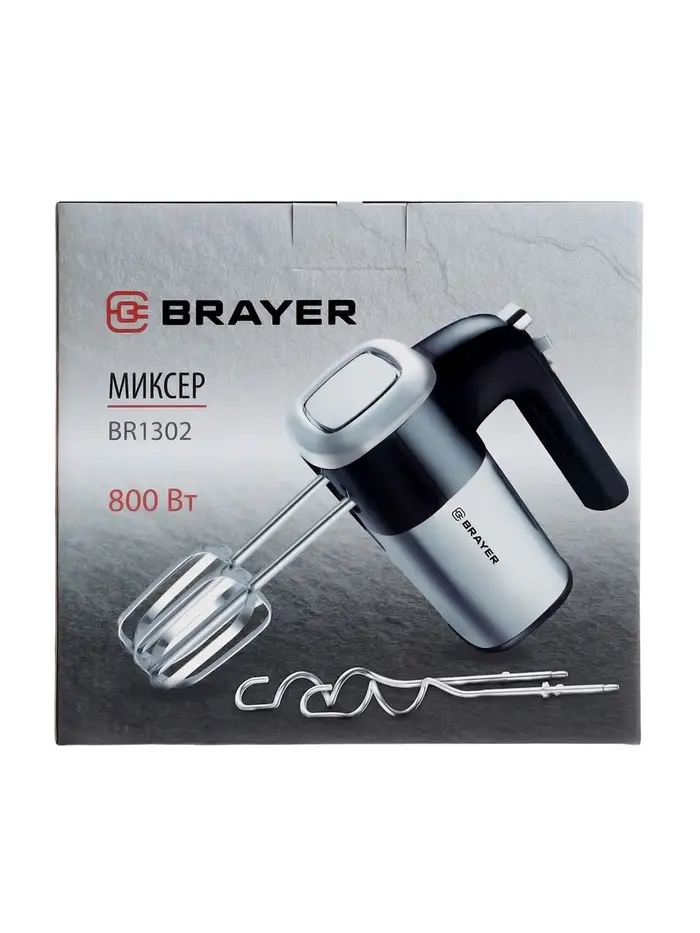 Миксер BRAYER 1302BR, ручной, 800 Вт, 5 скоростей, 2 насадки, чёрно-серый