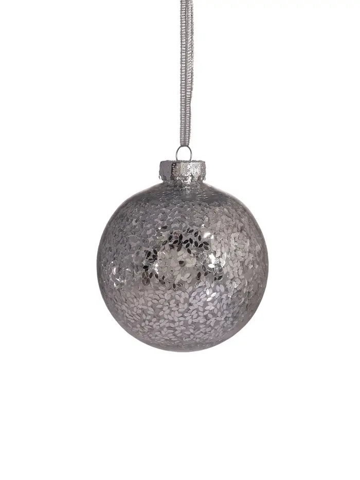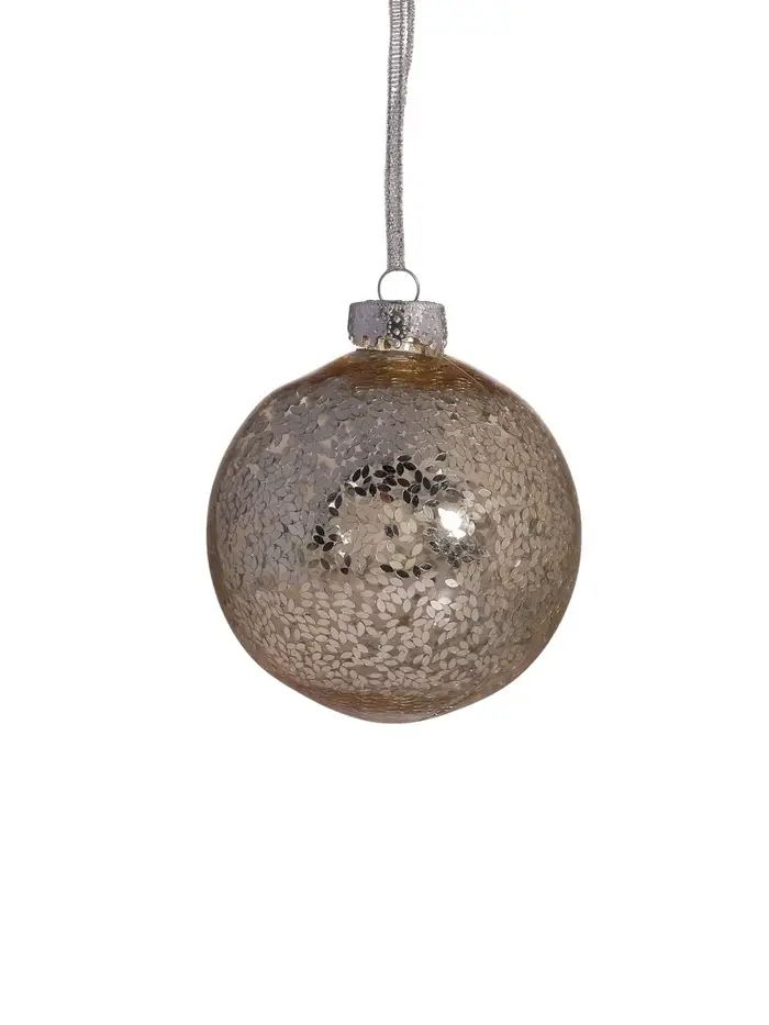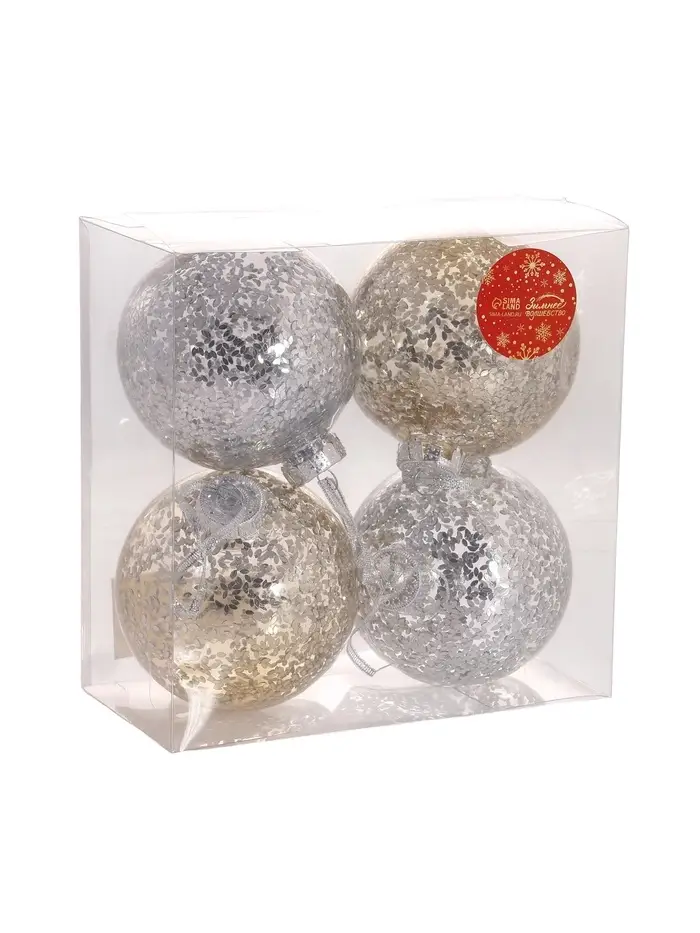 - Комплект из 4 прозрачных шаров с наполнением в золотистых и серебристых тонах.