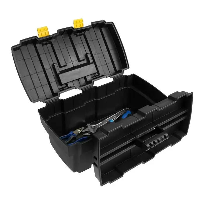 Область применения: Ящик используют для хранения и перевозки профессионального инструмента на объекты, в сервисные центры и производственные помещения. Решение подходит автомеханикам, строительным бригадам, монтажникам и специалистам по обслуживанию оборудования. Чёрный цвет устойчив к загрязнениям и сохраняет деловой внешний вид.