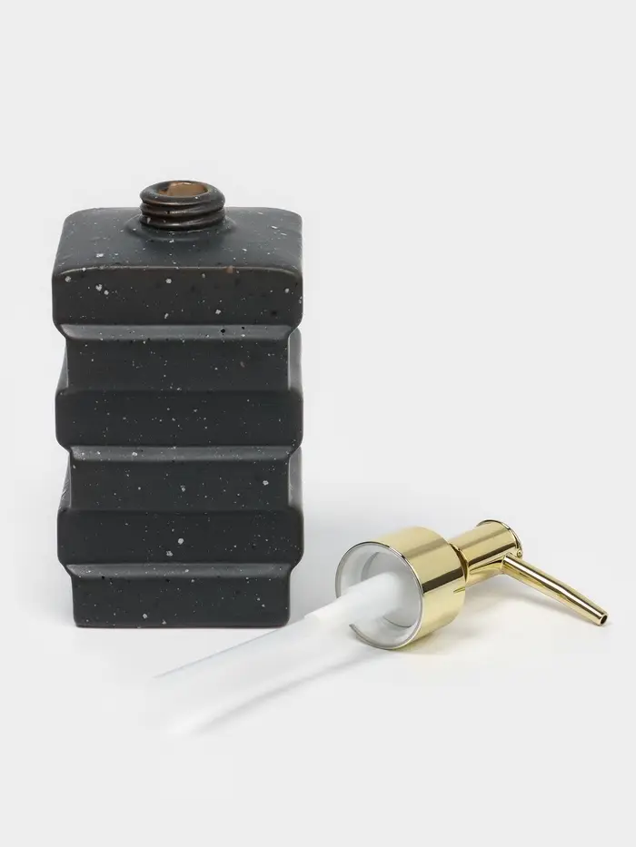 Черный керамический набор для ванной «Геометрия» состоит из двух предметов: стильного дозатора для мыла и изысканного стакана. Оба элемента выполнены с изюминкой в виде крапинок, что придает современный и минималистичный вид любому интерьеру. Прочный и эстетически привлекательный материал обеспечивает долговечность использования.