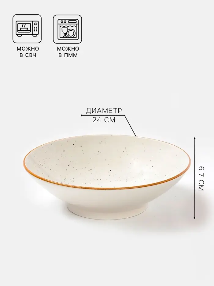 Большой салатник из фарфора объёмом 1,4 литра станет идеальным выбором для семейных обедов и праздничных застолий. Его круглая форма и диаметр 24 см обеспечивают удобство подачи больших порций салатов, закусок или первых блюд. Белоснежная поверхность с тонким рисунком в крапинку добавляет элегантности, а гладкая текстура легко очищается даже от самых стойких загрязнений.