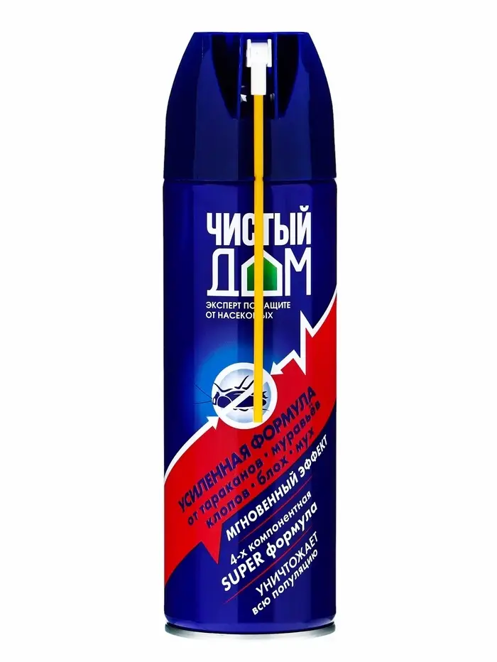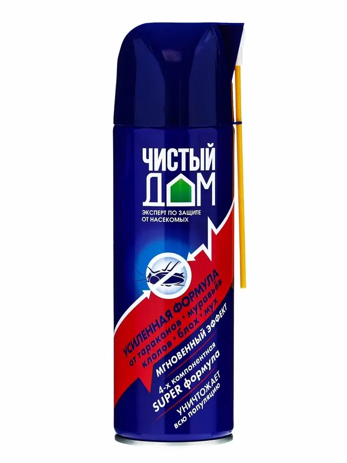 Аэрозоль "Чистый дом" является эффективным средством для борьбы с насекомыми в домашних условиях. Усиленная формула обеспечивает быстрое и надежное уничтожение насекомых, включая тараканов, муравьев, клопов и других вредителей.