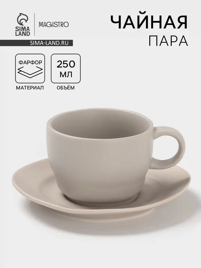 Чайная пара Magistro Potter, 2 предмета: чашка 250 мл, блюдце d=15.3 см, фарфор, светло-серая