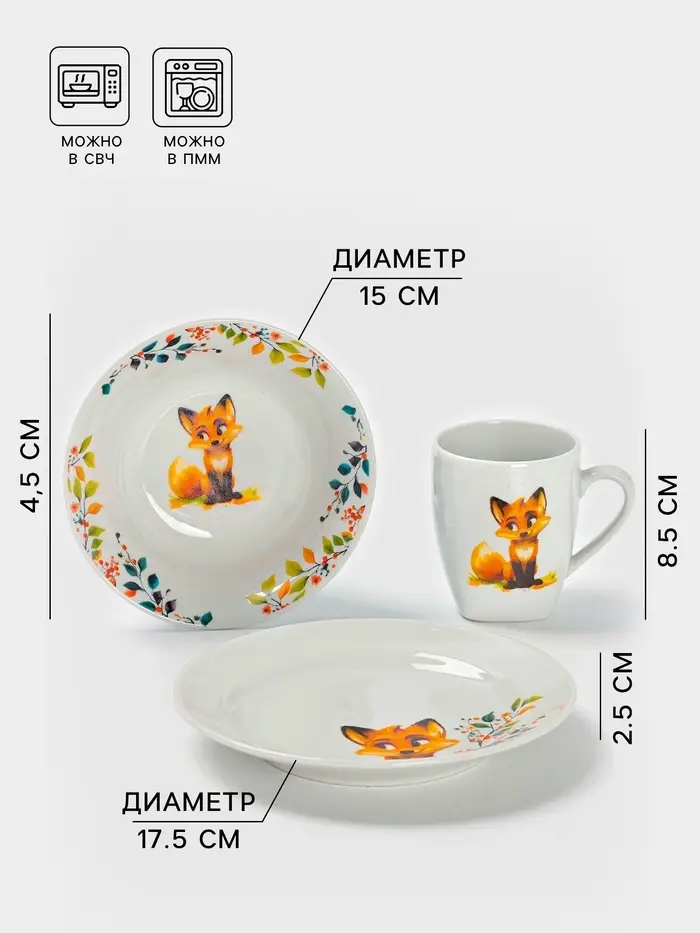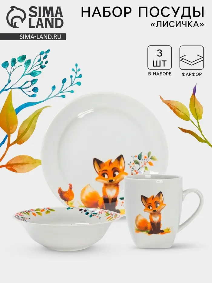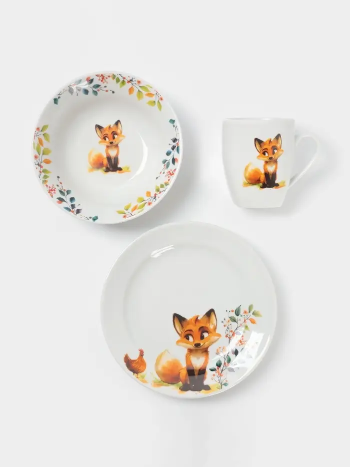 Очаровательный набор детской посуды с изображением лисы станет идеальным спутником для вашего малыша во время еды. В комплект входят тарелка, миска и кружка, выполненные из качественного фарфора. Белый цвет и милый рисунок создают уютную атмосферу, а удобные размеры подходят для детских порций.