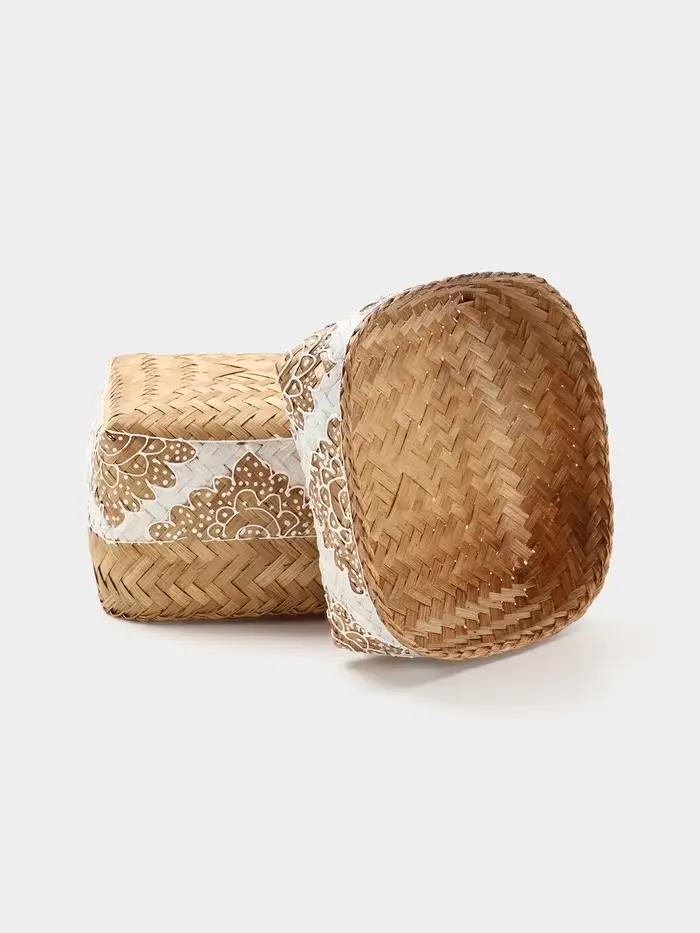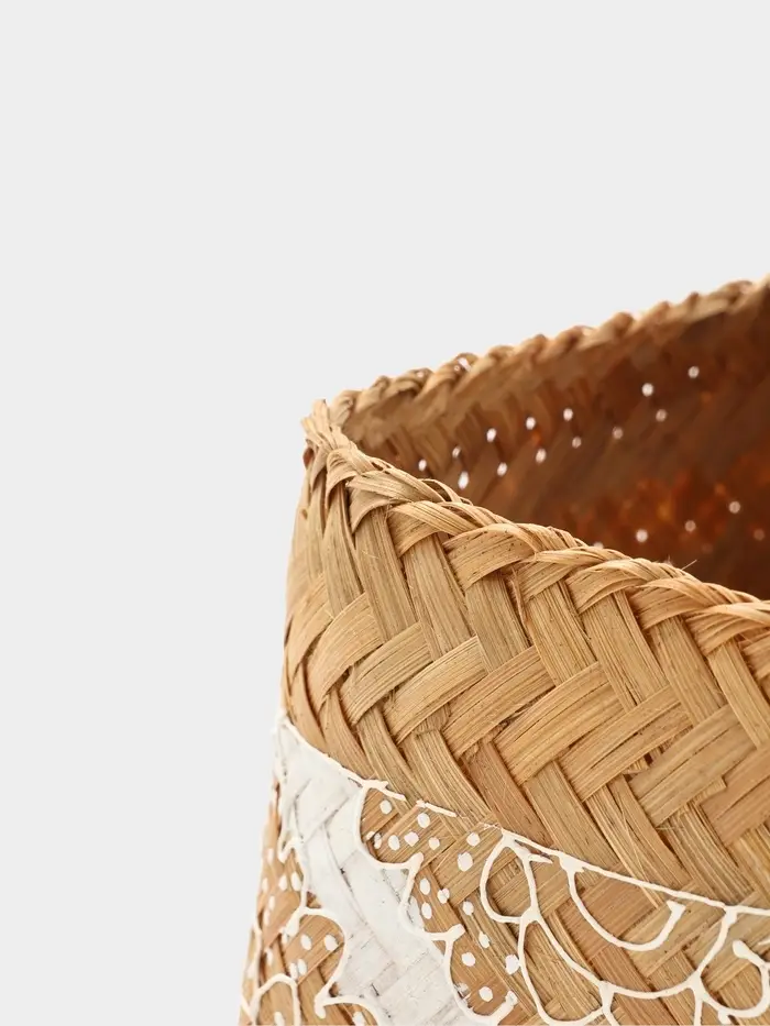 - Натуральный бамбук и изящное плетение: Каждая корзина сплетена вручную из экологичного бамбука. Плотное переплетение обеспечивает долговечность и устойчивость формы, а естественный светлый оттенок легко вписывается в любой интерьер — от скандинавского до эко-стиля.