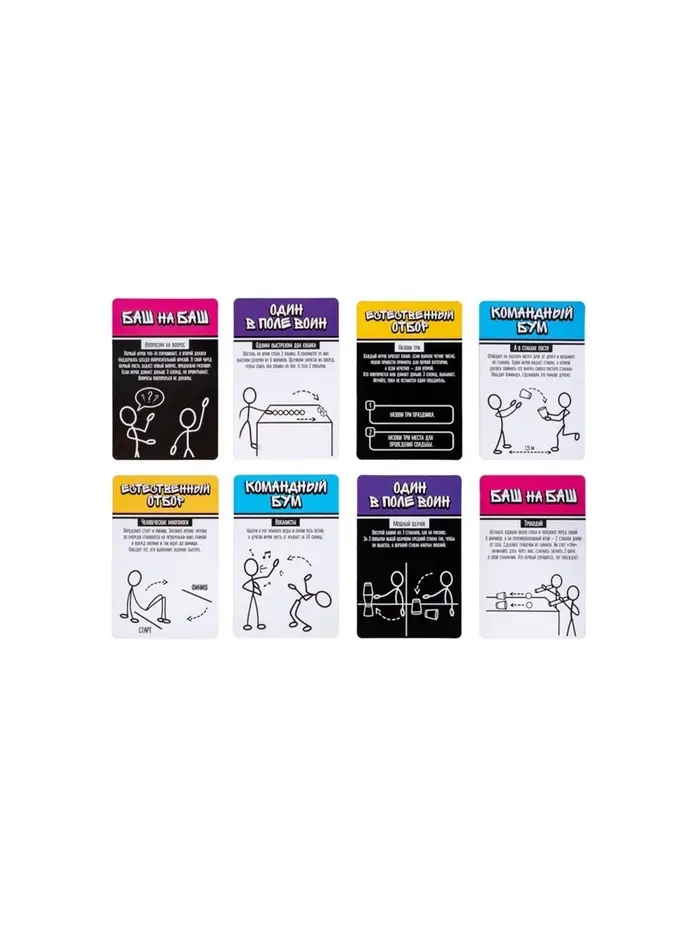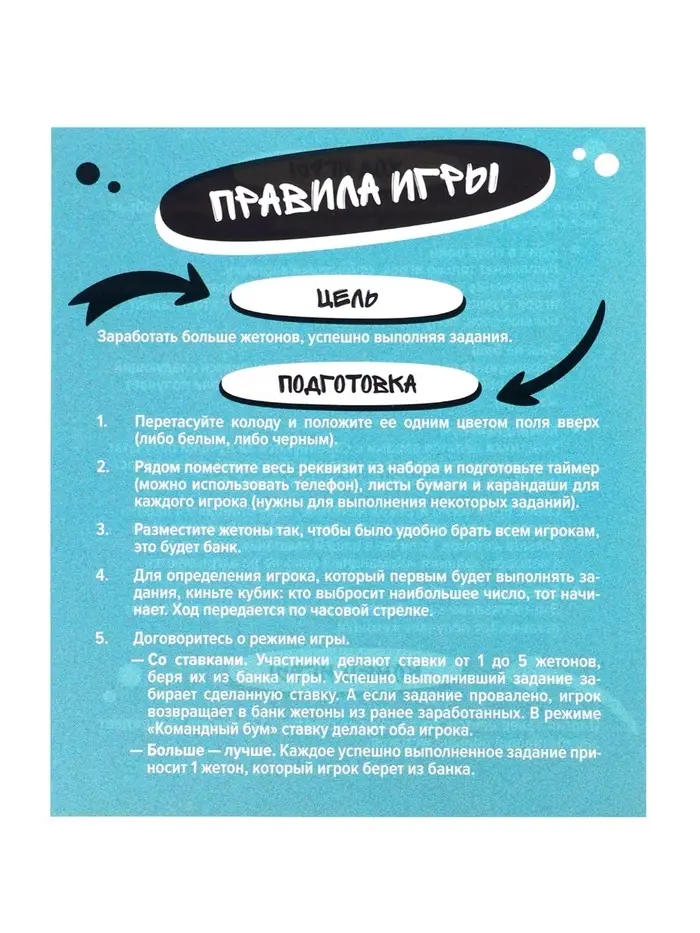 - Игрок снимает верхнюю карту с колоды, зачитывает задание с обратной стороны и выполняет его.
