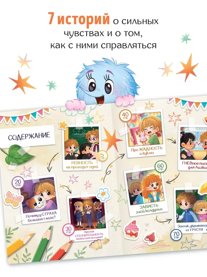 - 7 терапевтических историй о распространённых эмоциях: злость, одиночество, тревога, ревность, страх и другие.
