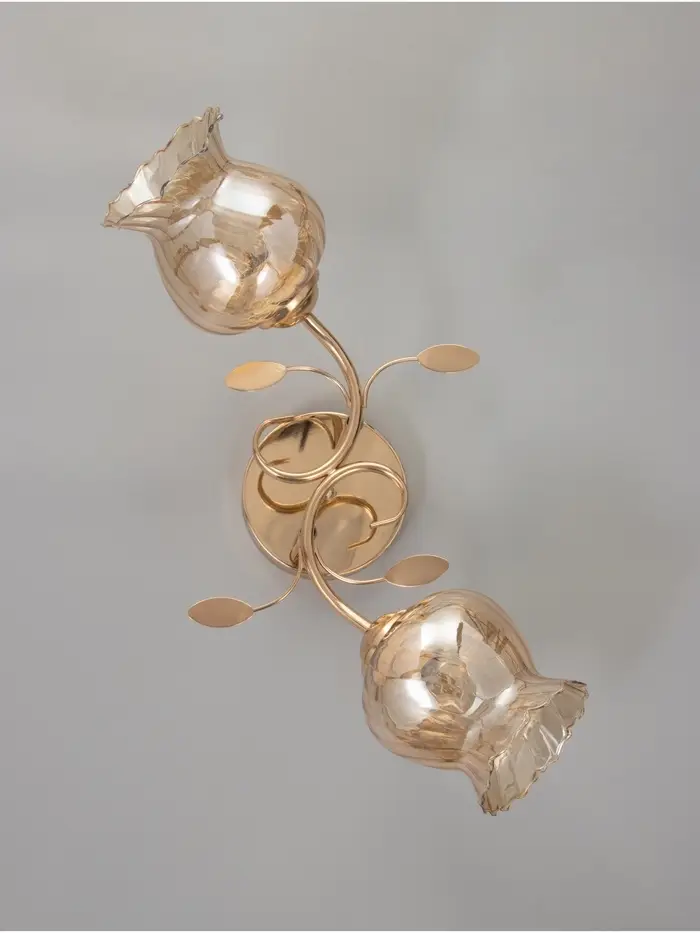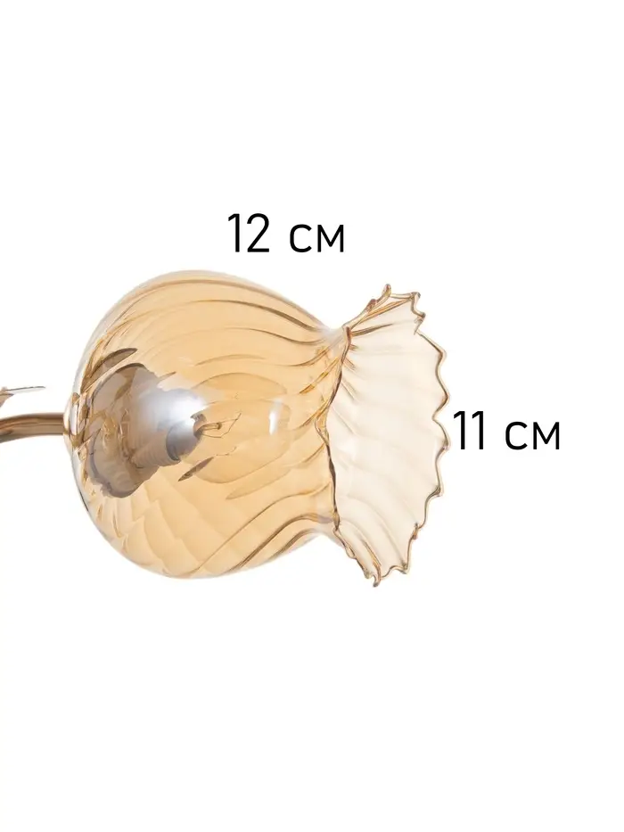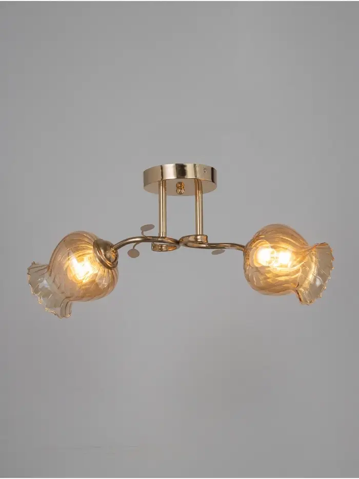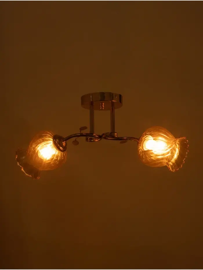 - Два стеклянных плафона с фигурной формой: Прозрачные и янтарные вставки преломляют свет, создавая мягкие блики на потолке. Форма плафонов напоминает классические мотивы — без излишеств, но с намёком на декор.