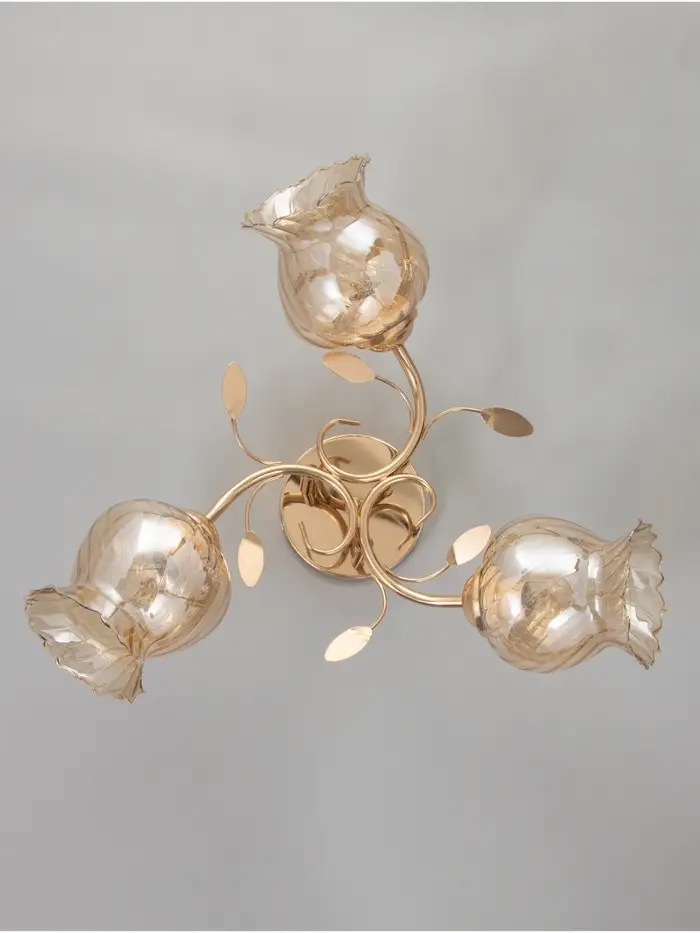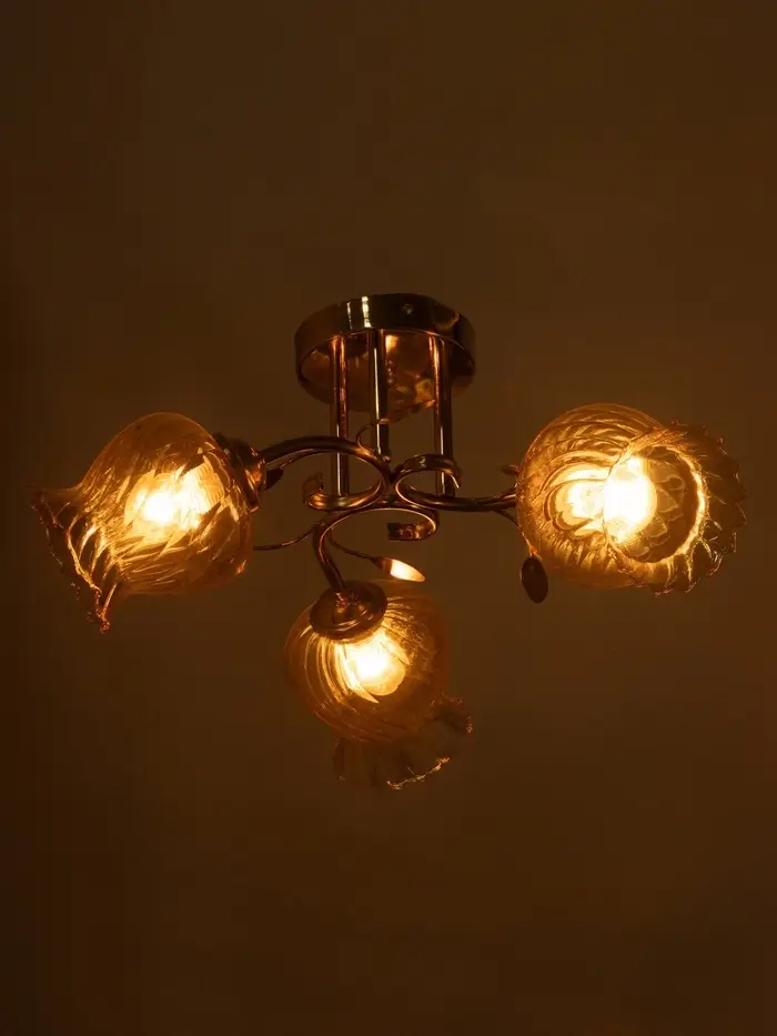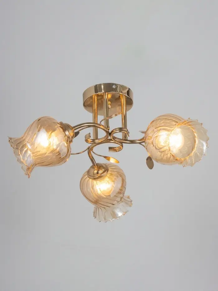 - Три стеклянных плафона с прозрачными и янтарными вставками: Свет преломляется в фактуре стекла, создавая лёгкие блики на потолке. Фигурная форма добавляет объёма, не нарушая компактности.