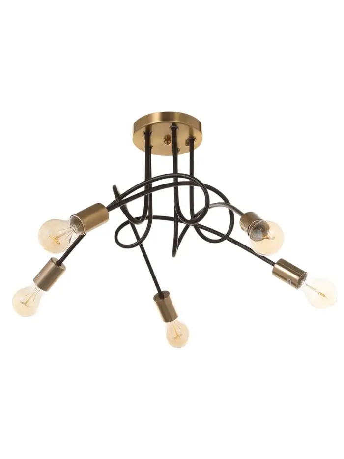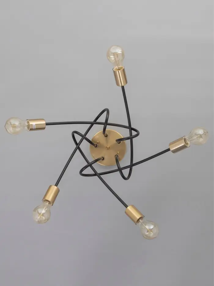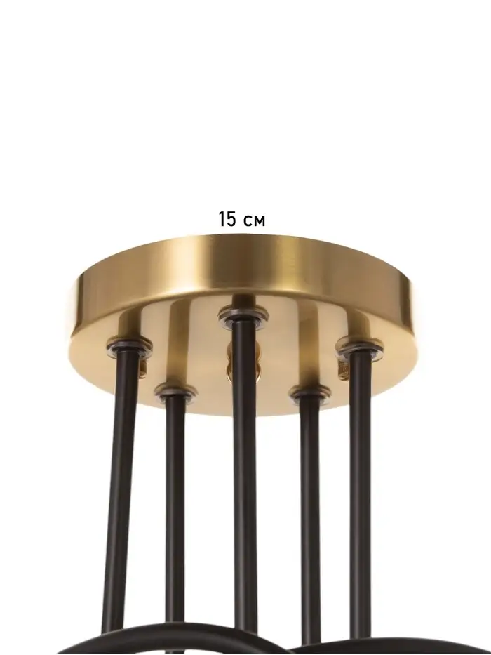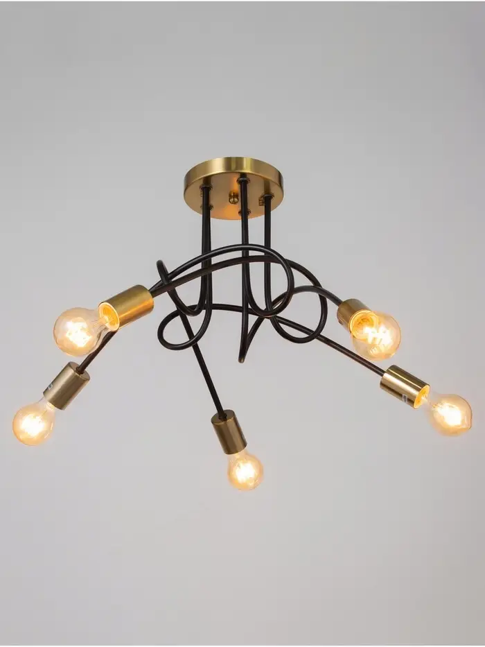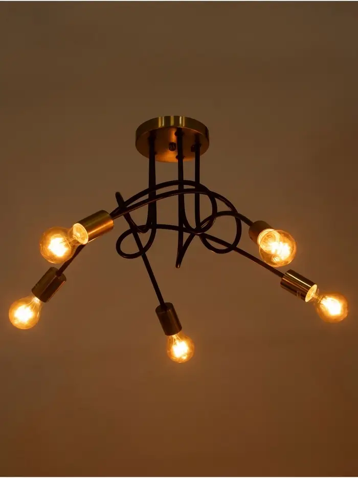 Свет, который держит баланс между силой и стилем. Пятирожковая потолочная люстра с чёрно-латунным металлическим основанием и открытыми лампами – это выразительное решение в стиле лофт, созданное для гостиной, кухни или интерьеров кафе, где важны мощное освещение, контрастные материалы и архитектурная выразительность.