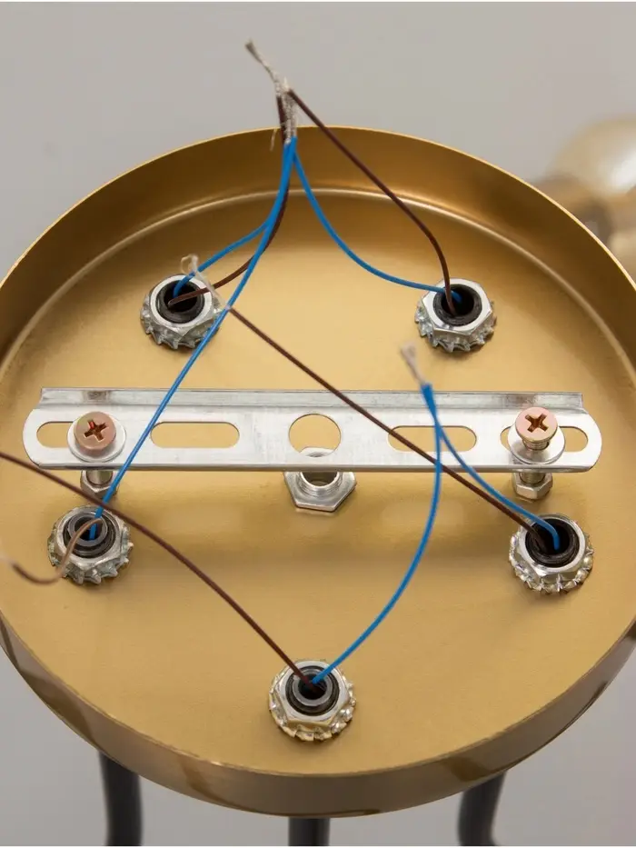 - Контраст металлов: Комбинация латунных и чёрных элементов придаёт светильнику глубину и характер. Латунь добавляет тёплый, почти винтажный акцент, а чёрный металл — строгость и индустриальность.
