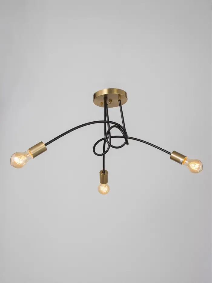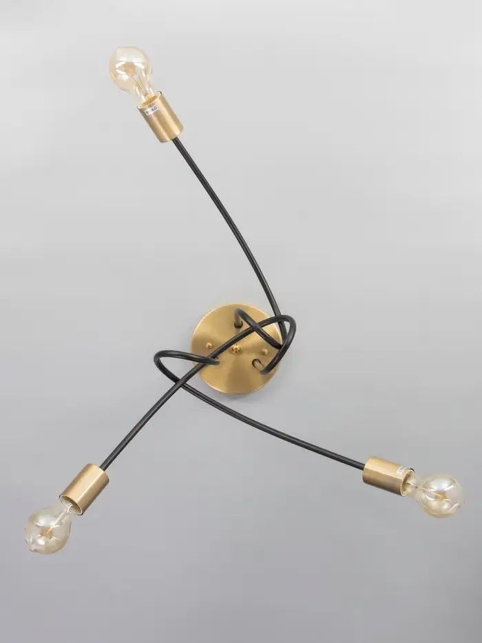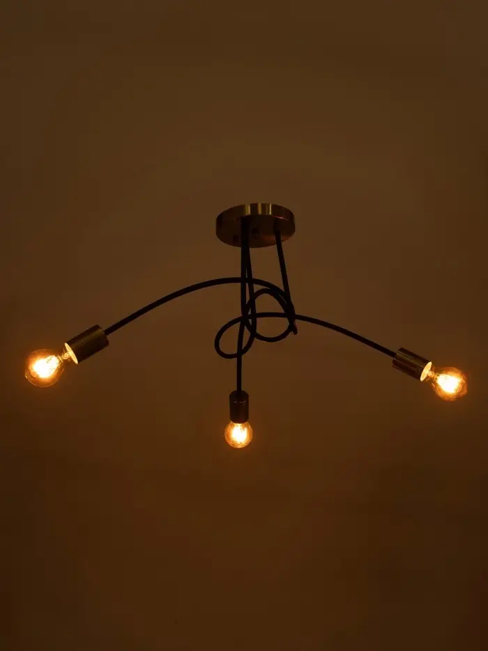 Свет, который держит форму. Трёхрожковая потолочная люстра с чёрно-латунным металлическим основанием и открытыми лампами – это выразительное решение в стиле лофт, созданное для гостиной, кухни или интерьеров кафе, где важны характер света, благородные оттенки и архитектурная простота.
