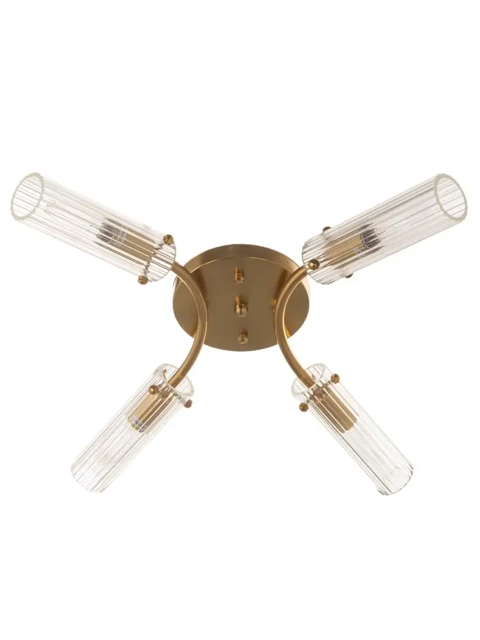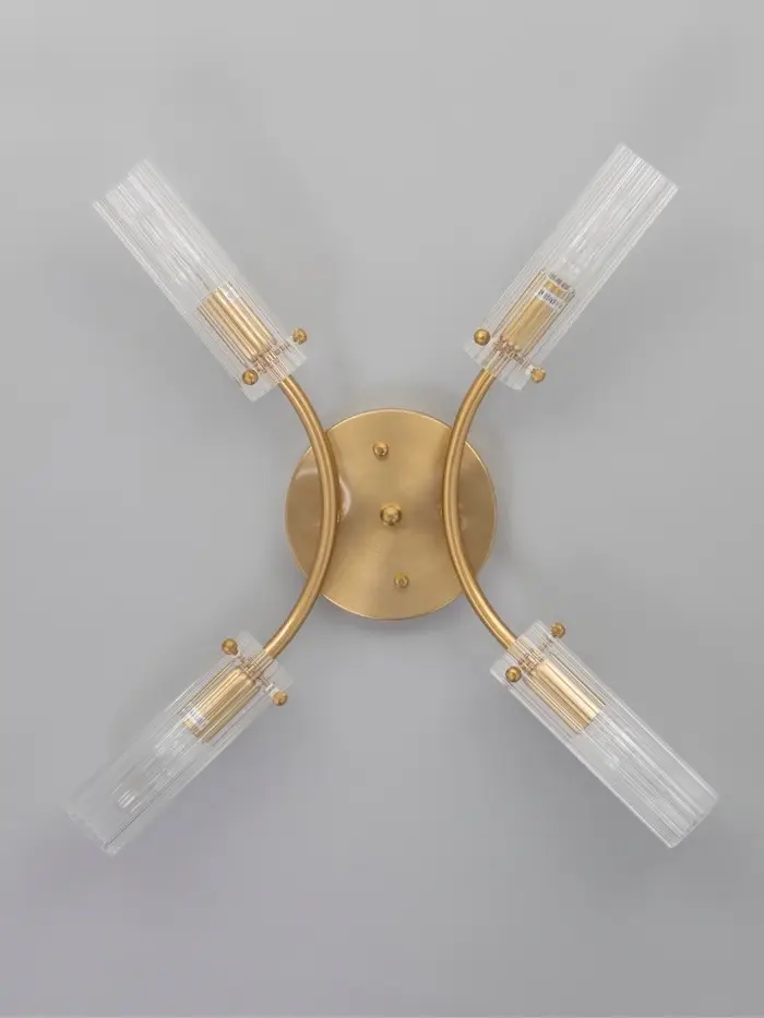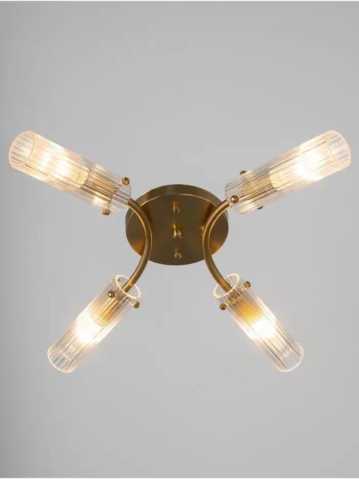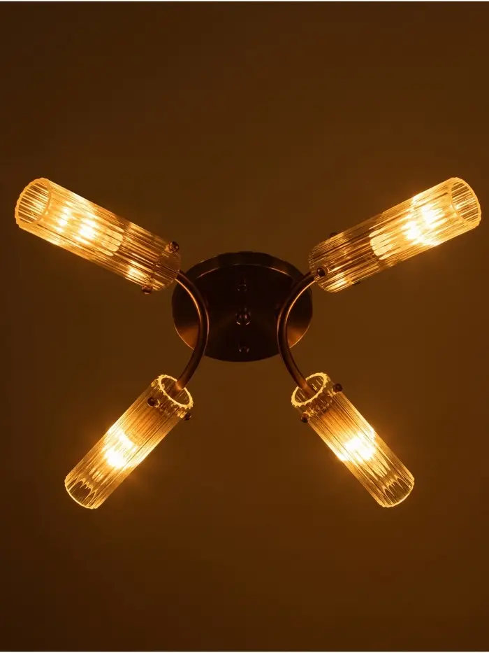 - Сильный световой поток: Четыре лампы формата E27 (до 40 Вт каждая) обеспечивают яркое, равномерное освещение с общим световым потоком 1260–2800 лм, достаточное для помещений площадью до 8 м². Прозрачные стеклянные цилиндры не рассеивают, а усиливают свет, подчёркивая объём пространства.