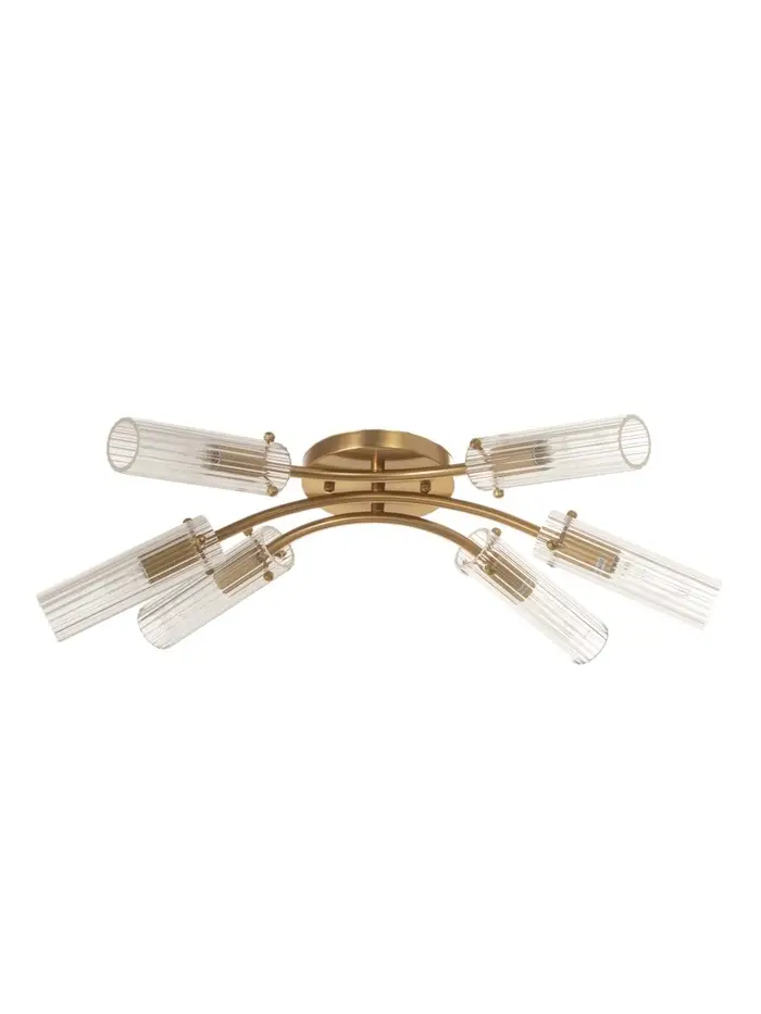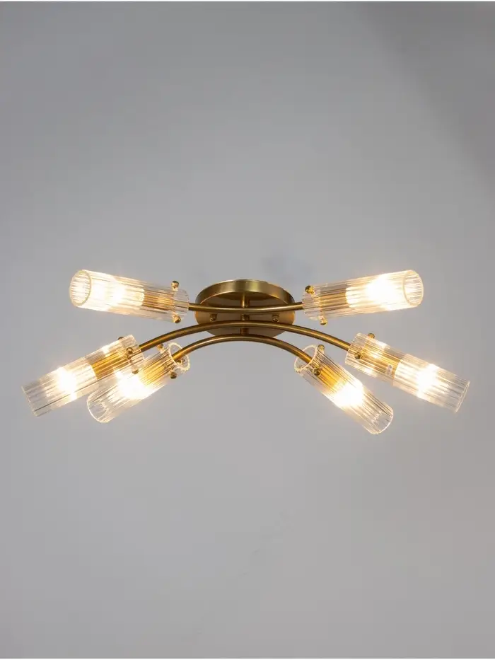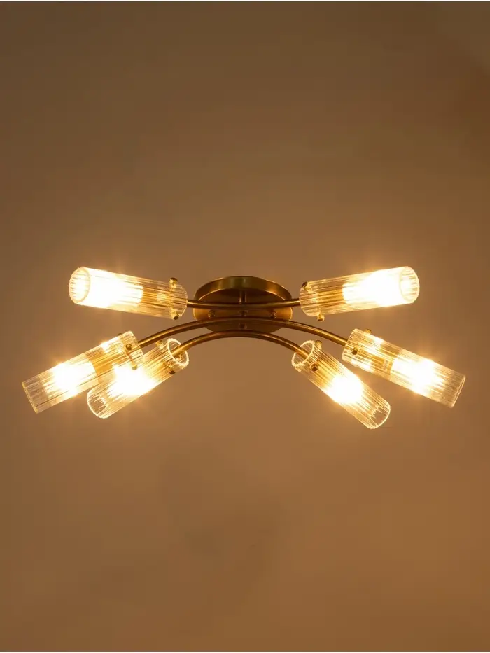 Свет, который подчёркивает объём. Шестирожковая потолочная люстра с бронзовым металлическим основанием и прозрачными цилиндрами – это выразительное освещение для гостиной или прихожей, где важны насыщенность света, графичность и благородные оттенки.