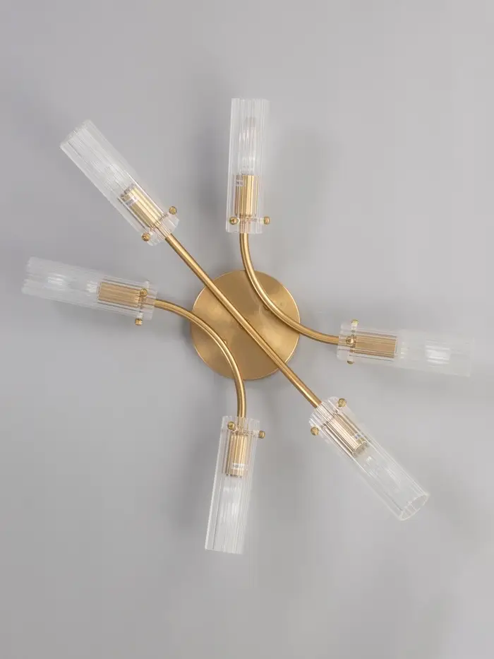 Чёткая геометрия, прозрачность, баланс: Шесть цилиндрических плафонов расположены симметрично, создавая ощущение порядка и стабильности. Бронзовый каркас и прозрачное стекло работают в паре: металл добавляет веса, а стекло – лёгкости. Это не просто источник света – это архитектурный элемент, который организует пространство. Подходит для тех, кто ценит современный лофт, чёткие линии и свет, который работает как часть дизайна.