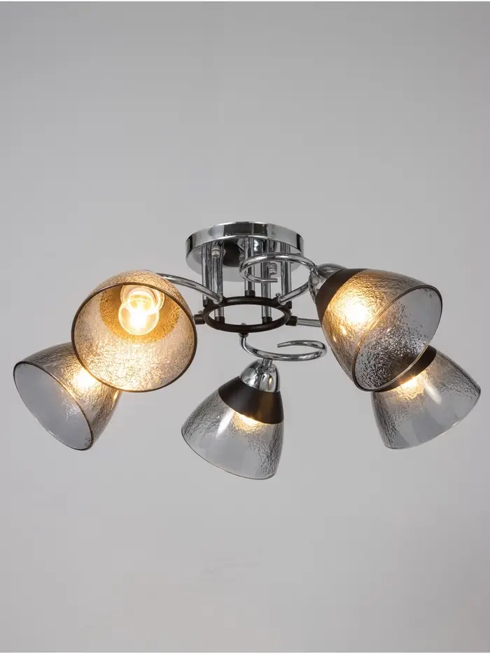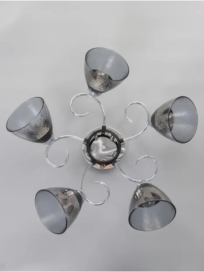 Свет, который заполняет пространство. Потолочная люстра 5 плафонов, хромированный металл, конусные стеклянные плафоны серо-чёрного оттенка – это современное решение для прихожей или кухни, где важны насыщенное освещение, чёткая геометрия и сдержанный, технологичный стиль.