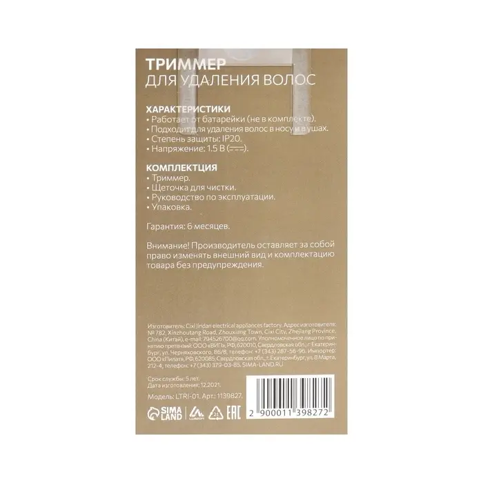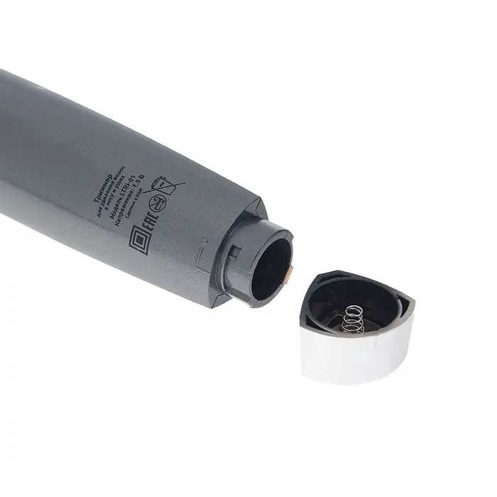 Триммер работает от одной батарейки типа AA, что делает его мобильным и удобным в использовании. В комплекте идёт защитная крышка и щёточка для чистки лезвий, обеспечивая удобство хранения и ухода.