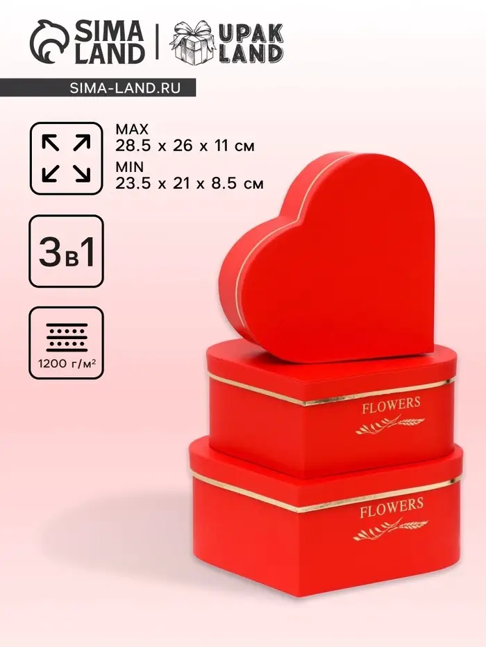 - Три коробки увеличенного размера: В набор входят коробки трех габаритов: большая, средняя и маленькая. Это дает возможность упаковать крупные подарки — от парфюмерных наборов до мягких игрушек и цветочных композиций — в едином стиле. Коробки удобно хранятся вложенными друг в друга.