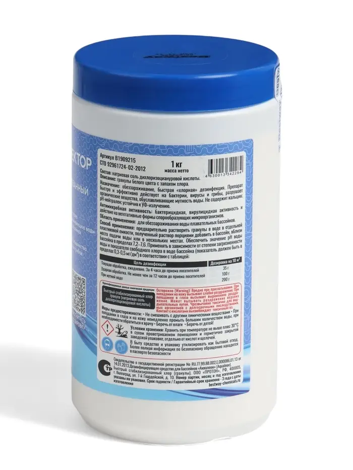 Гранулы белого цвета предназначены для ручной обработки воды частных бассейнов, содержат 60% активного, натриевую соль дихлоризоциануровой кислоты.