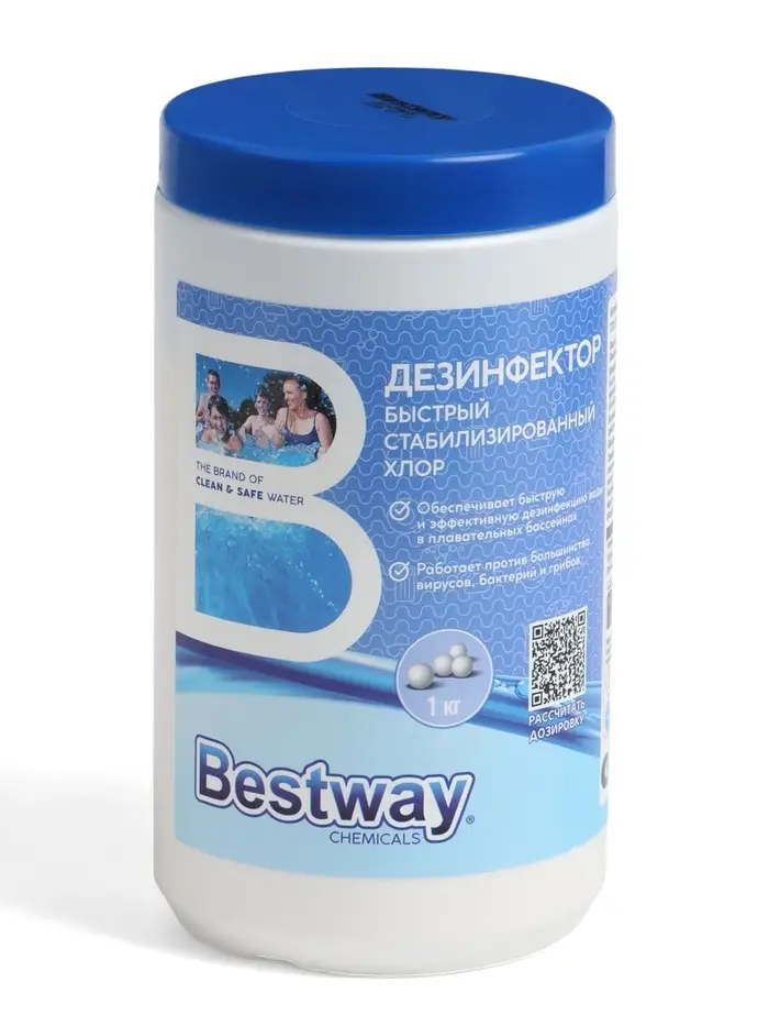 Дезинфектор Bestway быстрый стабилизированный хлор в гранулах обеззараживает дезинфицирует воду бассейна. Препарат стремительно и эффективно действует на бактерии, вирусы и грибы, разрушает органические вещества, обуславливающие мутность воды. Не содержит кальция, рН-нейтрален, устойчив к УФ-излучению.