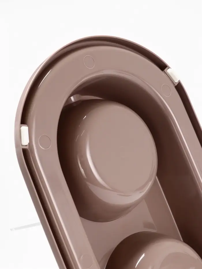 - Эргономичная подставка: Миски расположены на ножках, что удобно как для мелких, так и для средних пород. Правильная высота подачи способствует более комфортному приёму пищи и уходу за осанкой.