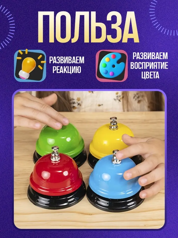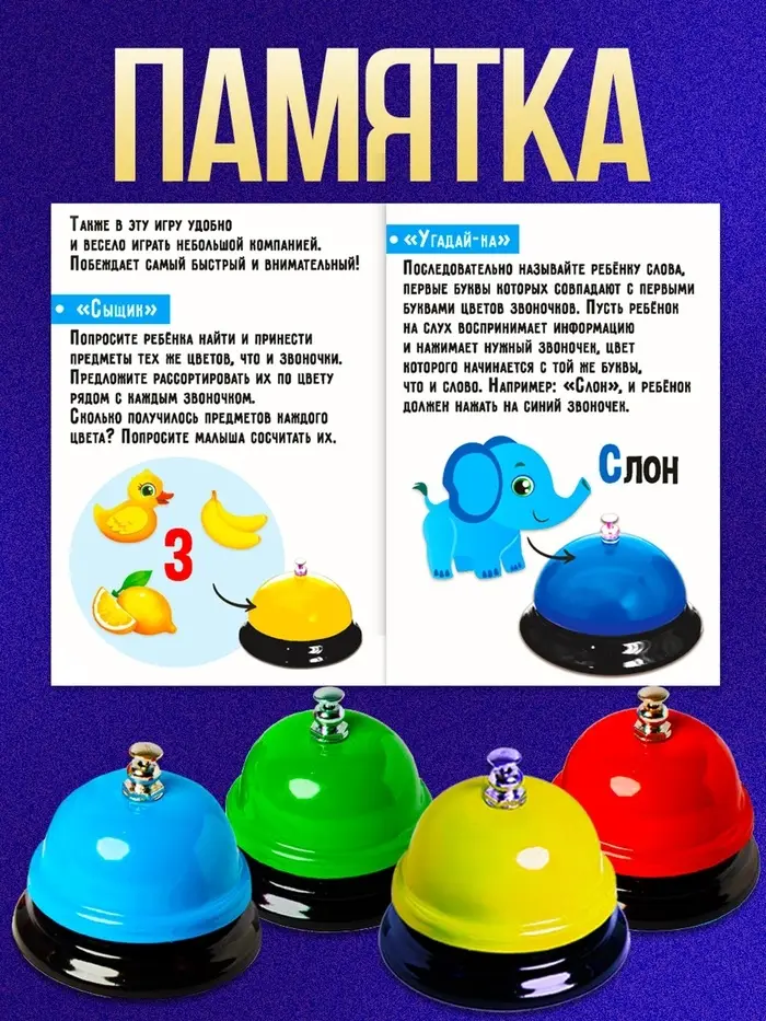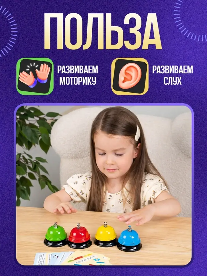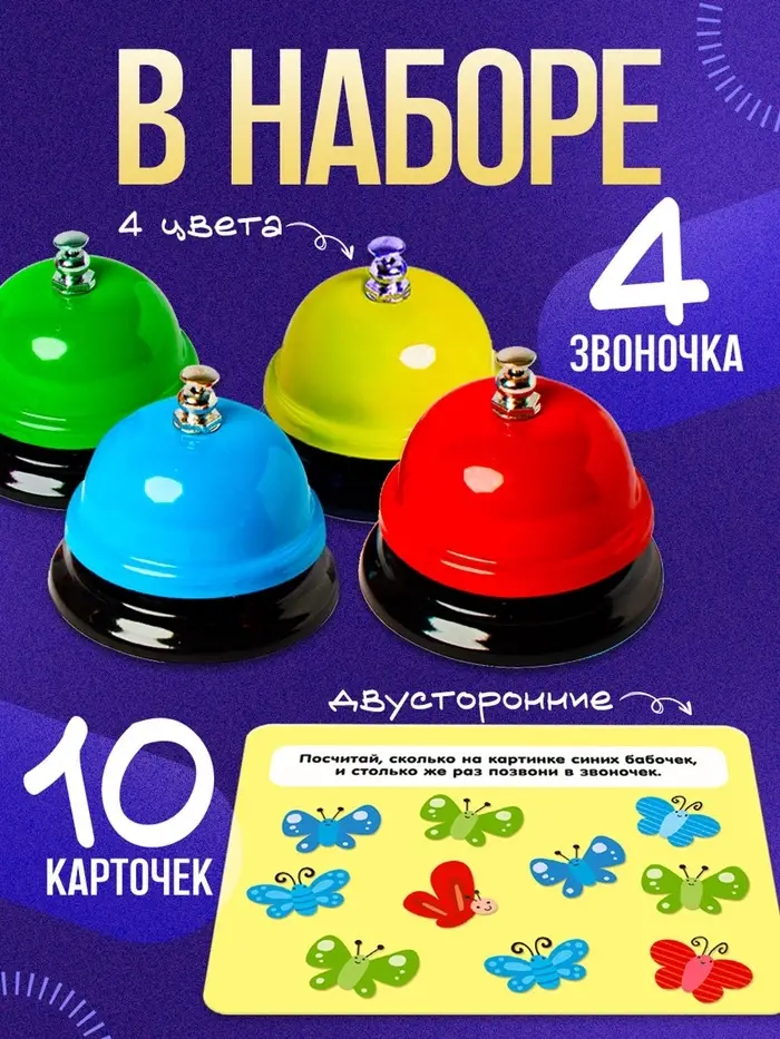 Развивающий набор станет любимой игрушкой вашего ребёнка. В нём малыш обнаружит 4 цветных звонких колокольчика. Они помогут ему запомнить цвета, цифры, научиться считать и решать много полезных заданий с карточек!