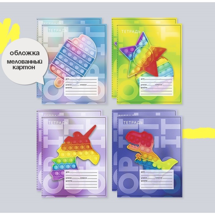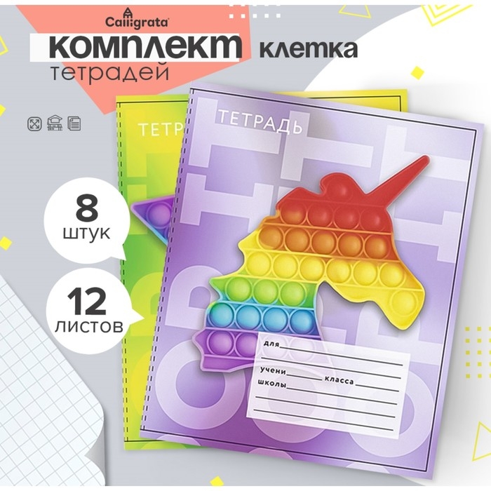 Комплект тетрадей из 8 штук, 12 листов в клетку Calligrata "Поп-ИТ", обложка мелованный картон, блок офсет, 4 вида по 2 штуки