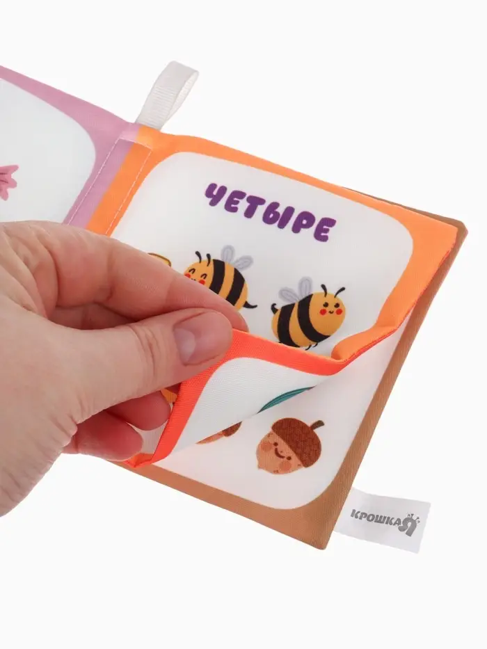 - Книжка выполнена из мягкого текстиля с шуршащими элементами для тактильного и звукового развлечения.