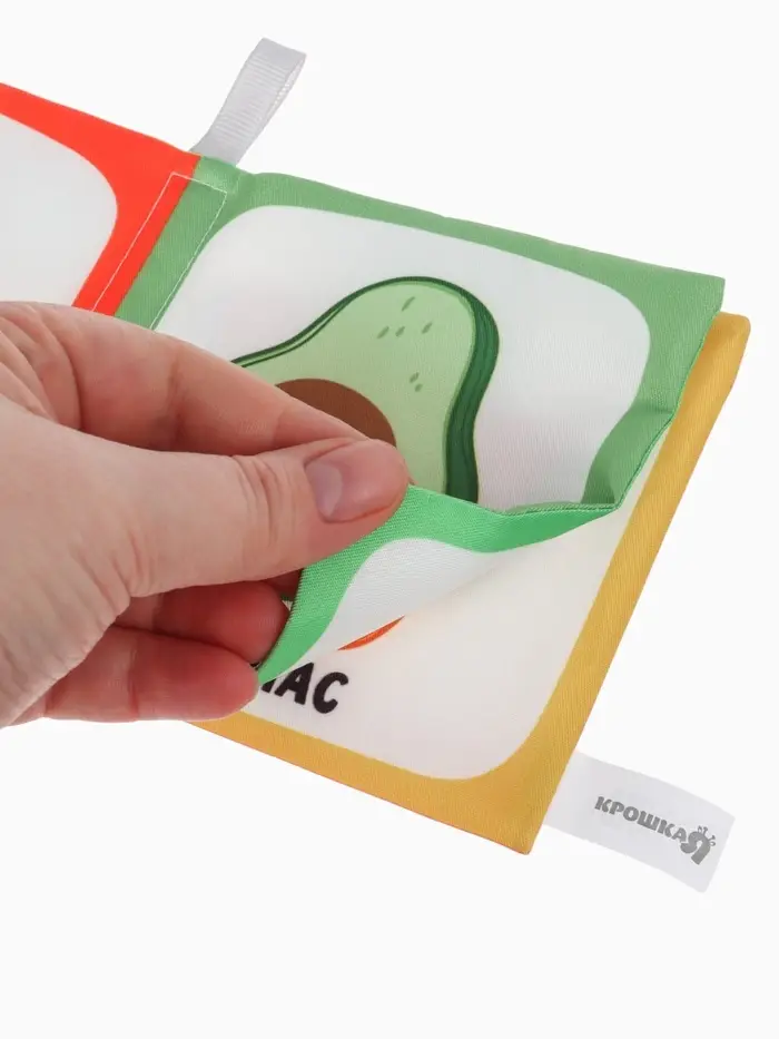 - Книжка выполнена из мягкого текстиля с шуршащими элементами для тактильного и звукового развлечения.