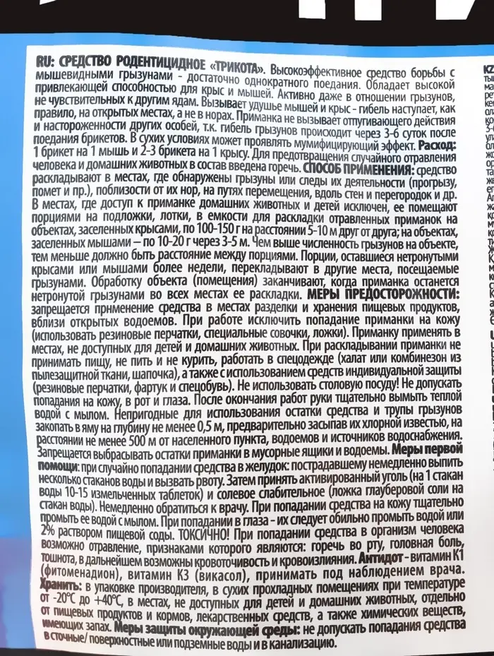 Расход: 1 брикет на 1 мышь и 2-3 брикета на 1 крысу. Для предотвращения случайного отравления человека и домашних животных в состав брикетов введена горечь.