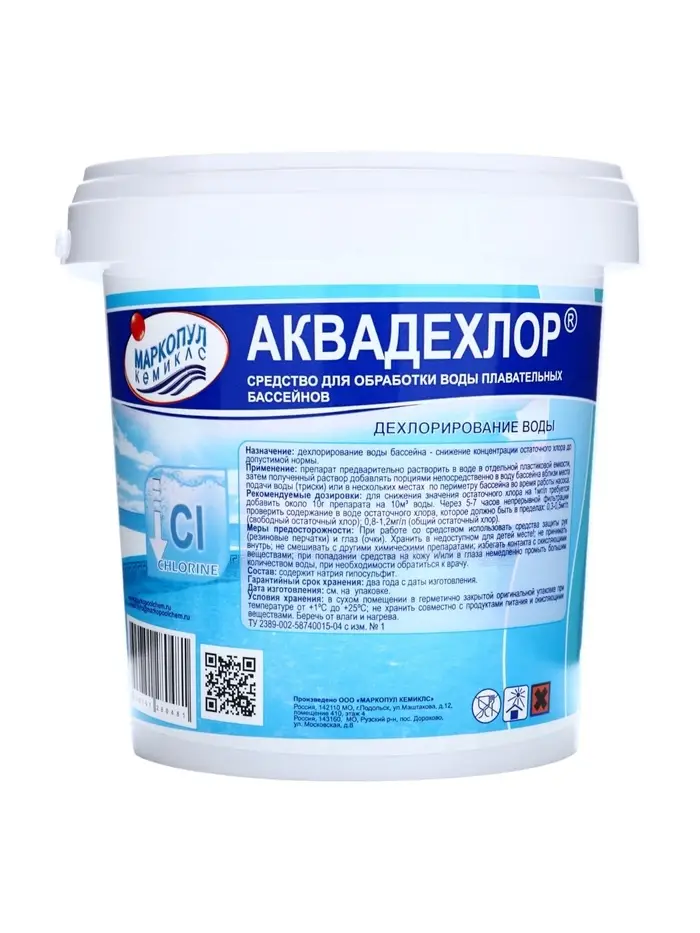 Рекомендуемая дозировка: для снижения значения остаточного хлора на 1мг/л требуется добавить 100г препарата на 100м³ воды. Через 5-7 часов проверить содержание в воде остаточного хлора, которое должно быть в пределах: - 0,3-0,5мг/л (свободный остаточный хлор), - 0,8-1,2мг/л (общий остаточный хлор).