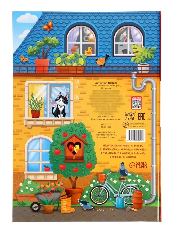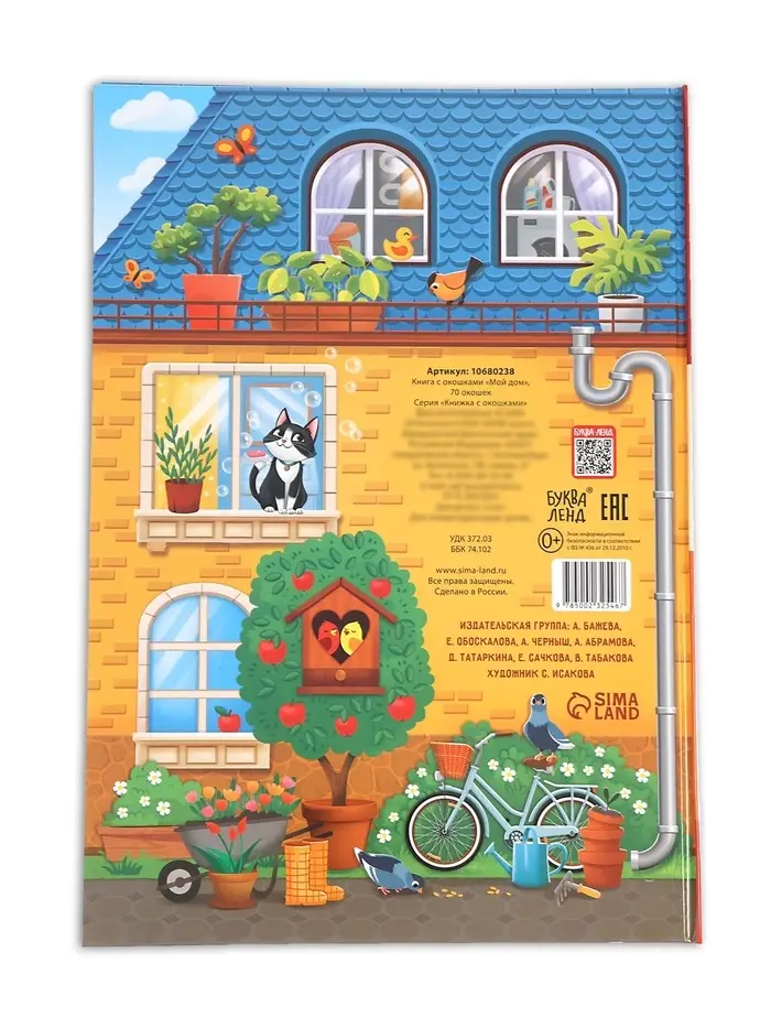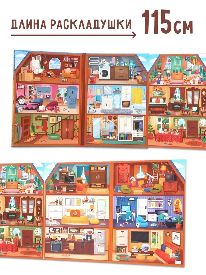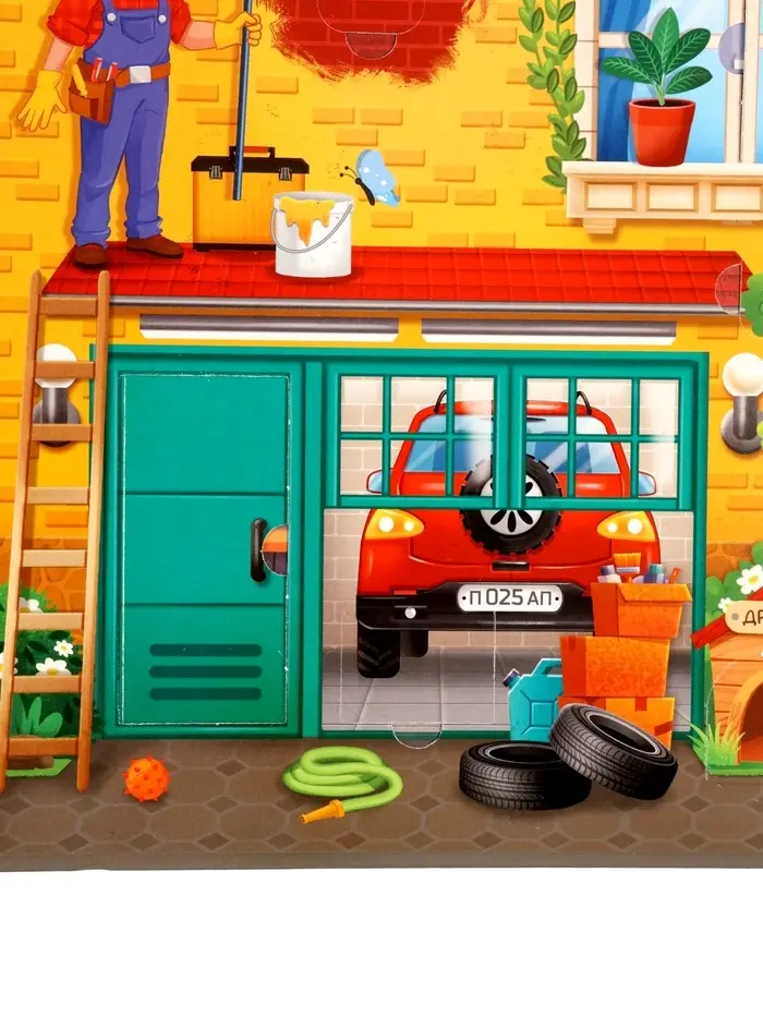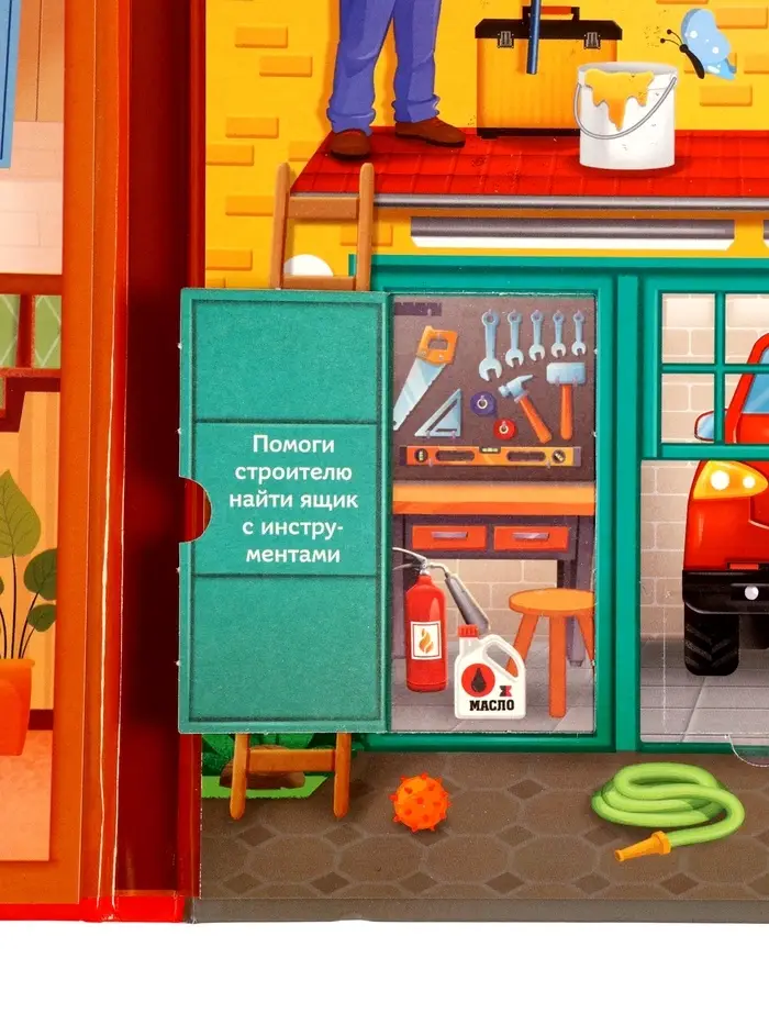 Эта книга напоминает волшебный домик, где за каждым окошком скрывается новое открытие. Ребёнок может передвигать персонажей, открывать двери и окна, словно исследует настоящий дом. Это похоже на игру с кукольным домиком, только вместо миниатюрных предметов — яркие картинки и интерактивные элементы, а результат всегда приносит радость и новые знания.