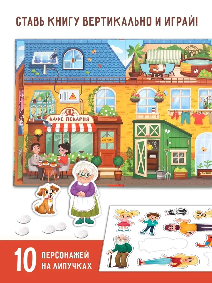 - 10 липучек с персонажами позволяют создавать свои истории, перемещая героев по страницам книги.