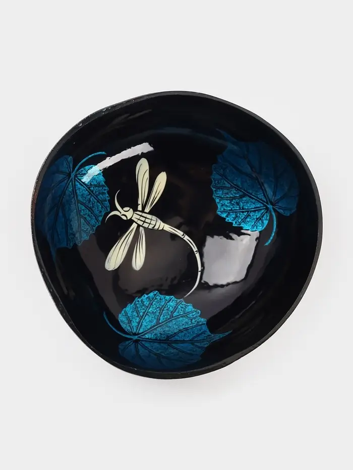 - Художественная роспись «Стрекоза»: Яркое и изящное изображение насекомого нанесено вручную, создавая живописный контраст с фоном из кокосовой скорлупы. Этот рисунок превращает практичную вещь в миниатюрное произведение искусства, наполненное символикой легкости и красоты.