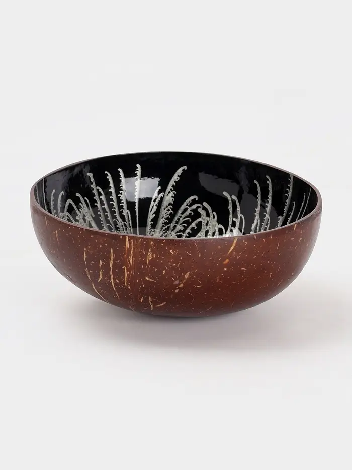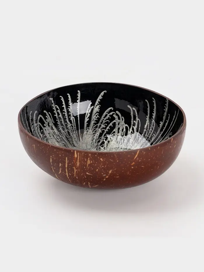 Природная эстетика в каждой детали. Чаша из цельного кокоса с ручной росписью — это уникальный предмет интерьера и практичная ёмкость, созданная вручную из натурального материала. Она сочетает грубоватую фактуру скорлупы с изящным абстрактным рисунком, привнося в пространство тепло и экзотическое настроение.