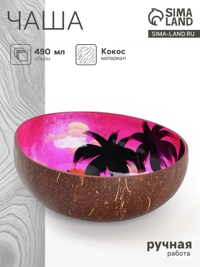 - Натуральный материал — кокос: Чаша изготовлена из скорлупы кокосового ореха. Это экологичный и долговечный материал с естественной текстурой. Поверхность отшлифована до гладкости, приятна на ощупь.