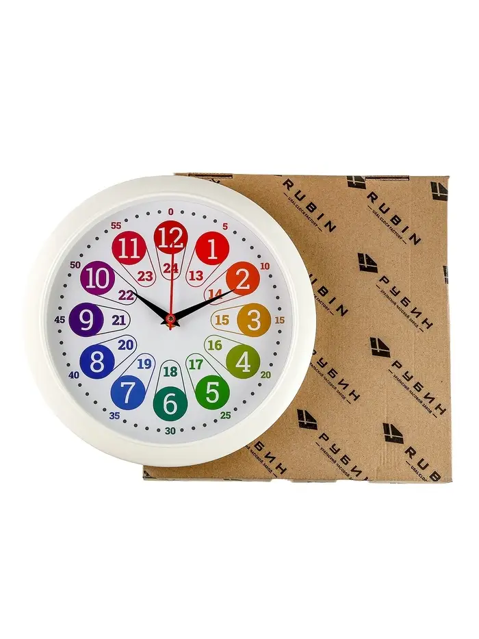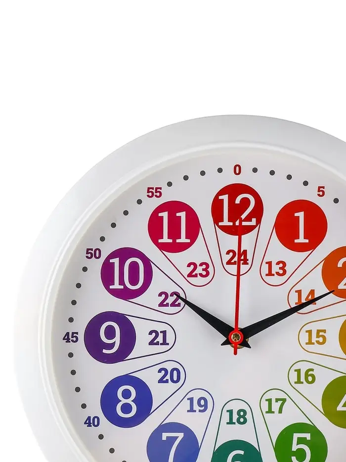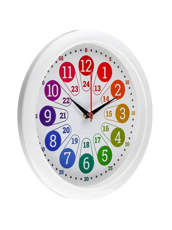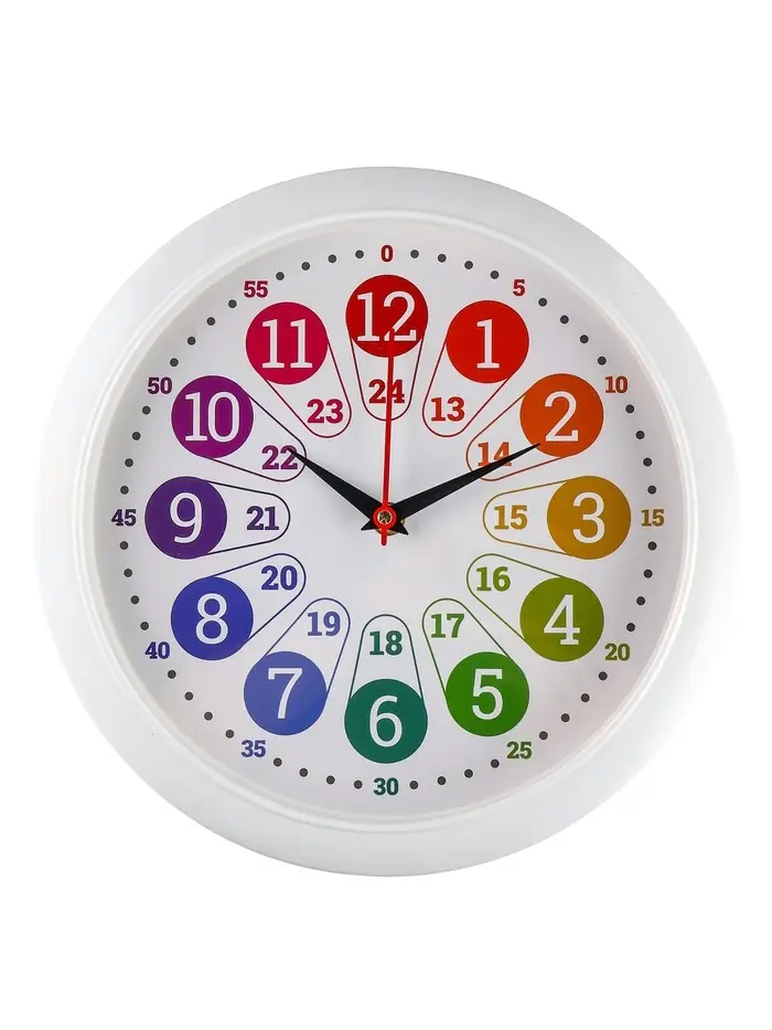 - Стильный дизайн: Белый корпус и разноцветный циферблат придают часам современный и привлекательный вид. Круглая форма делает их универсальными для любого интерьера.