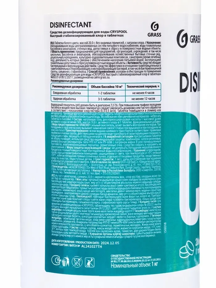 CRYSPOOL Быстрый стабилизированный хлор в таблетках, 1 кг — эффективная дезинфекция воды
